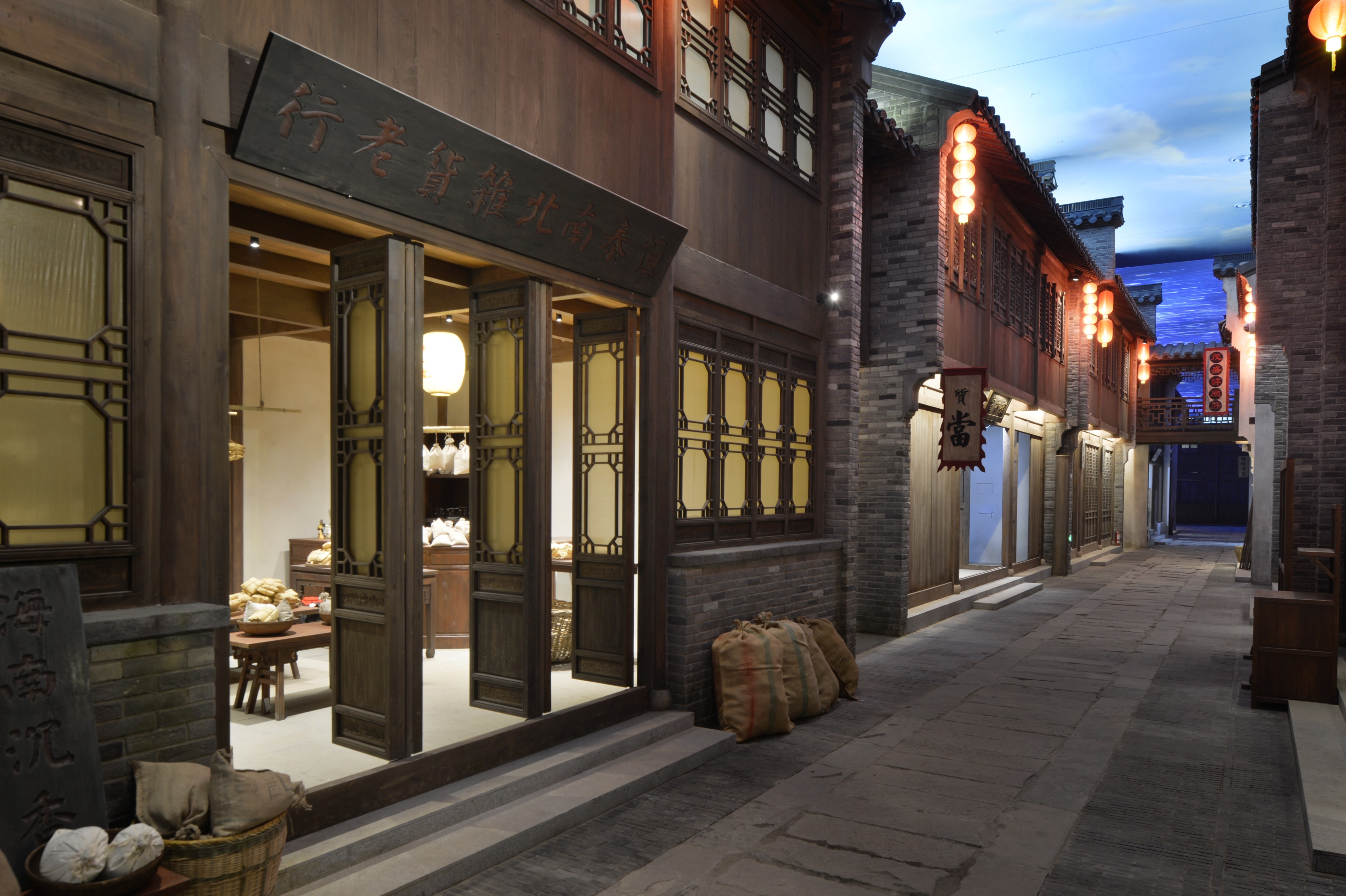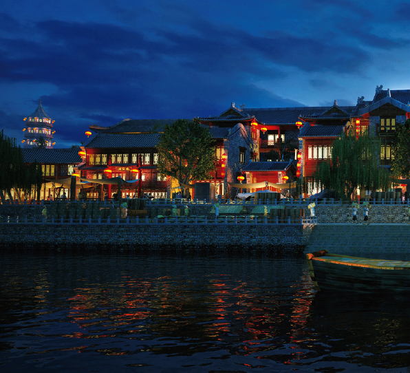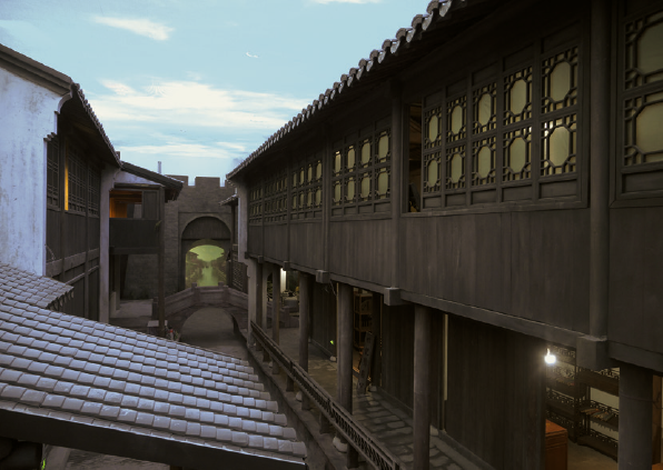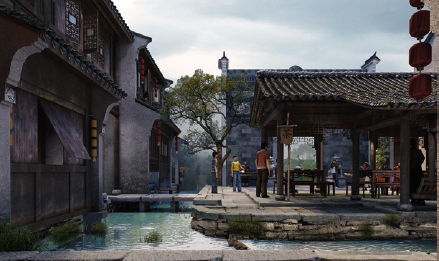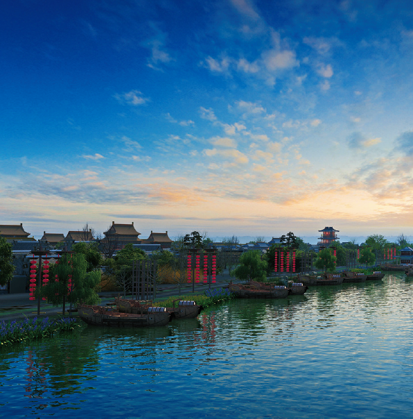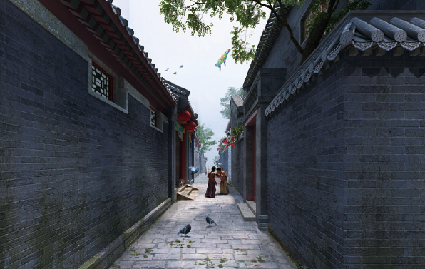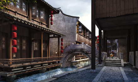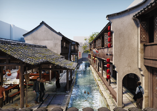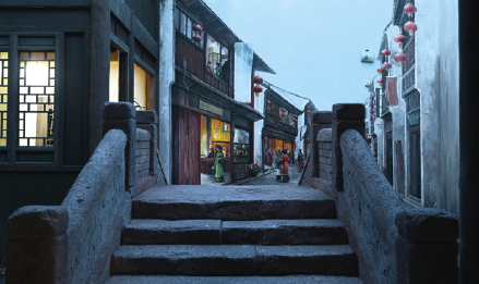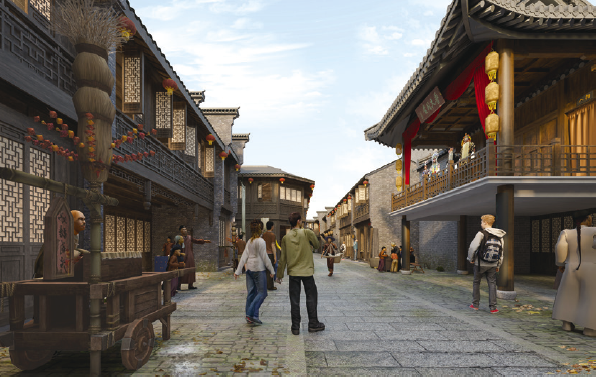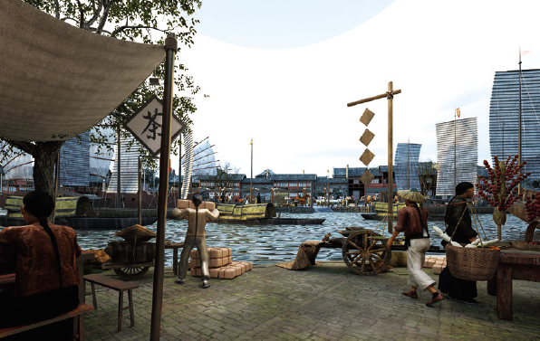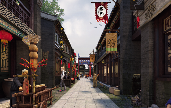 以京杭大运河北段城镇为参照原型,表现明清时期北方热闹的商街景观和静谧的胡同生活。