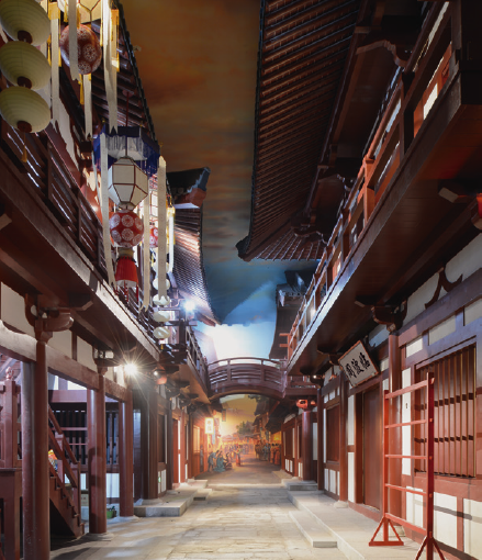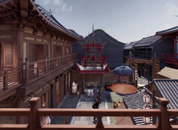 以隋唐时期洛阳城为参照原型,街道宽阔,楼阁飞桥,展现洛阳的盛世气度以及坊内集市贸易繁忙的景象。