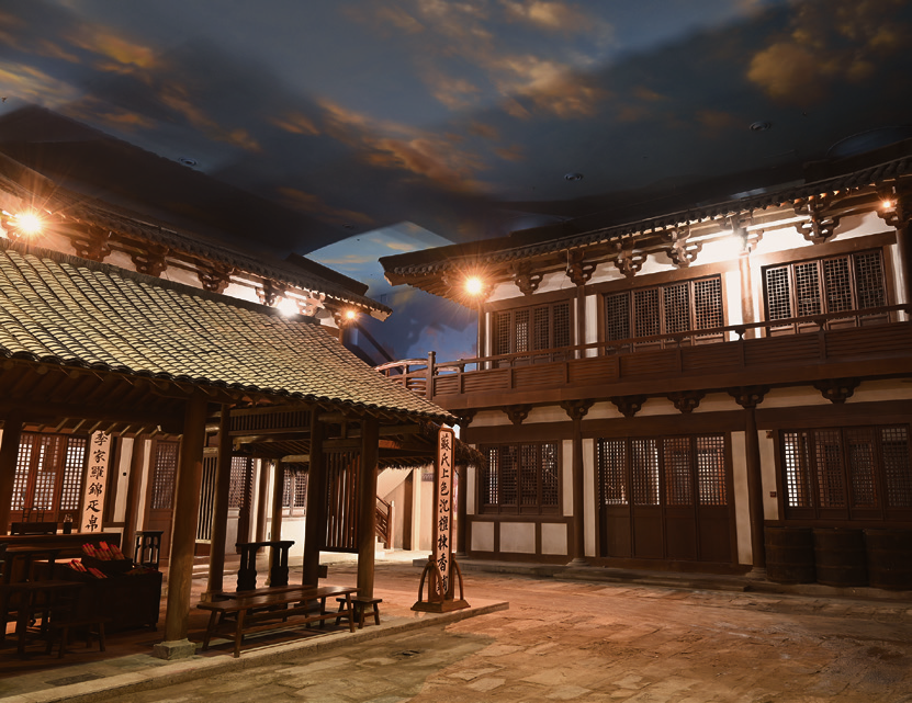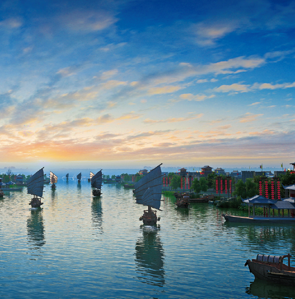 以京杭大运河中段城镇为参照原型,重点表现运河漕运枢纽城市淮安和盐业中心城市扬州,以商街、戏台、盐商住宅、码头、邮驿等展现这里的运河文化。
