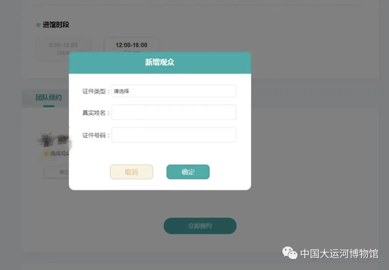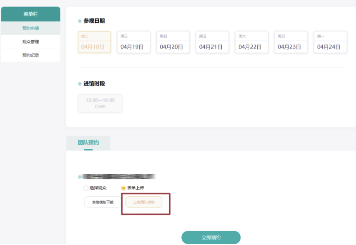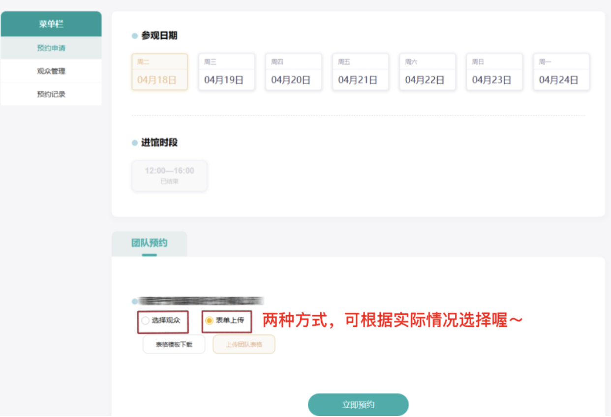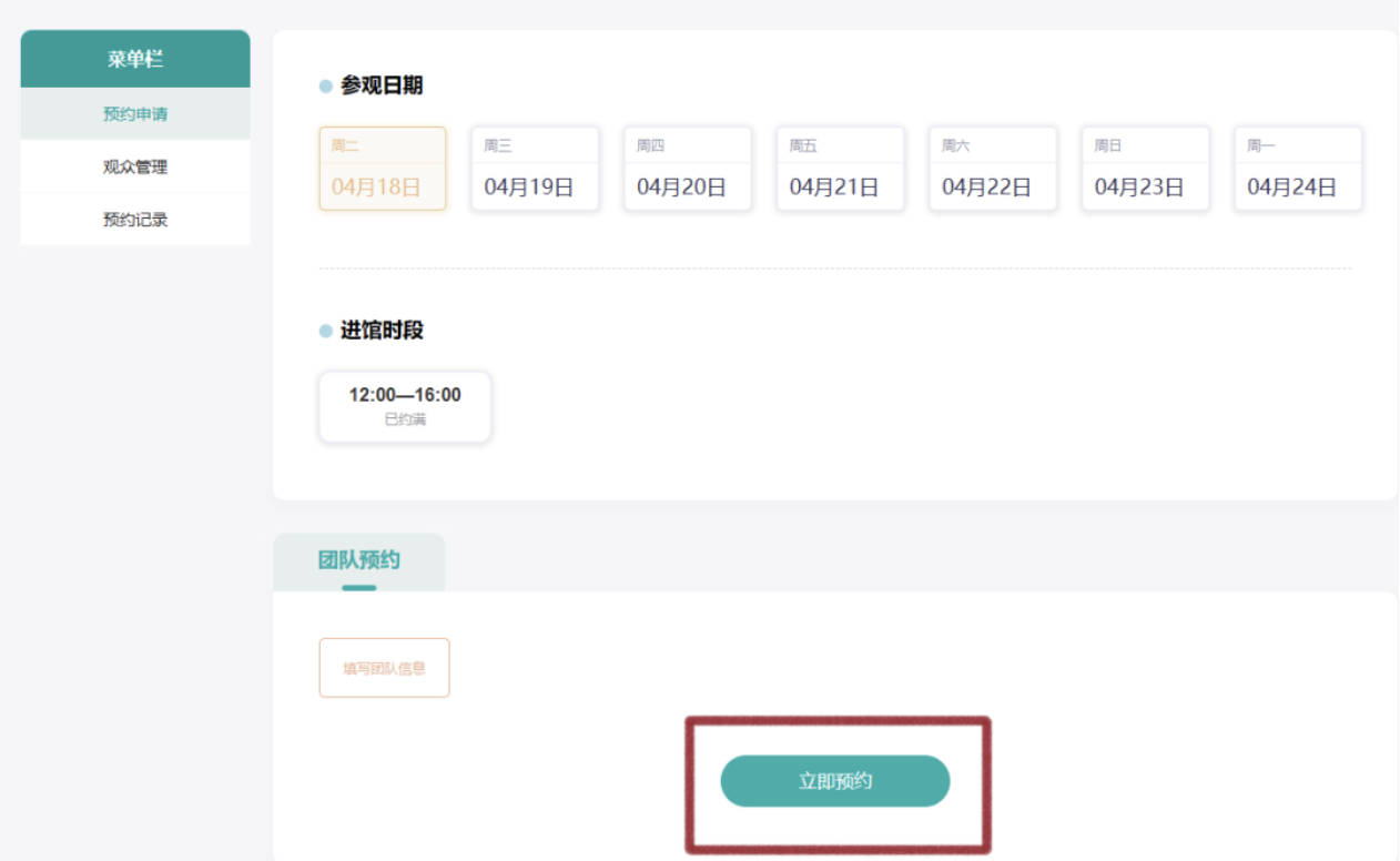 录入完成观众信息后,选择参观的时间和时段,点击【立即预约】按钮后即可完成预约。