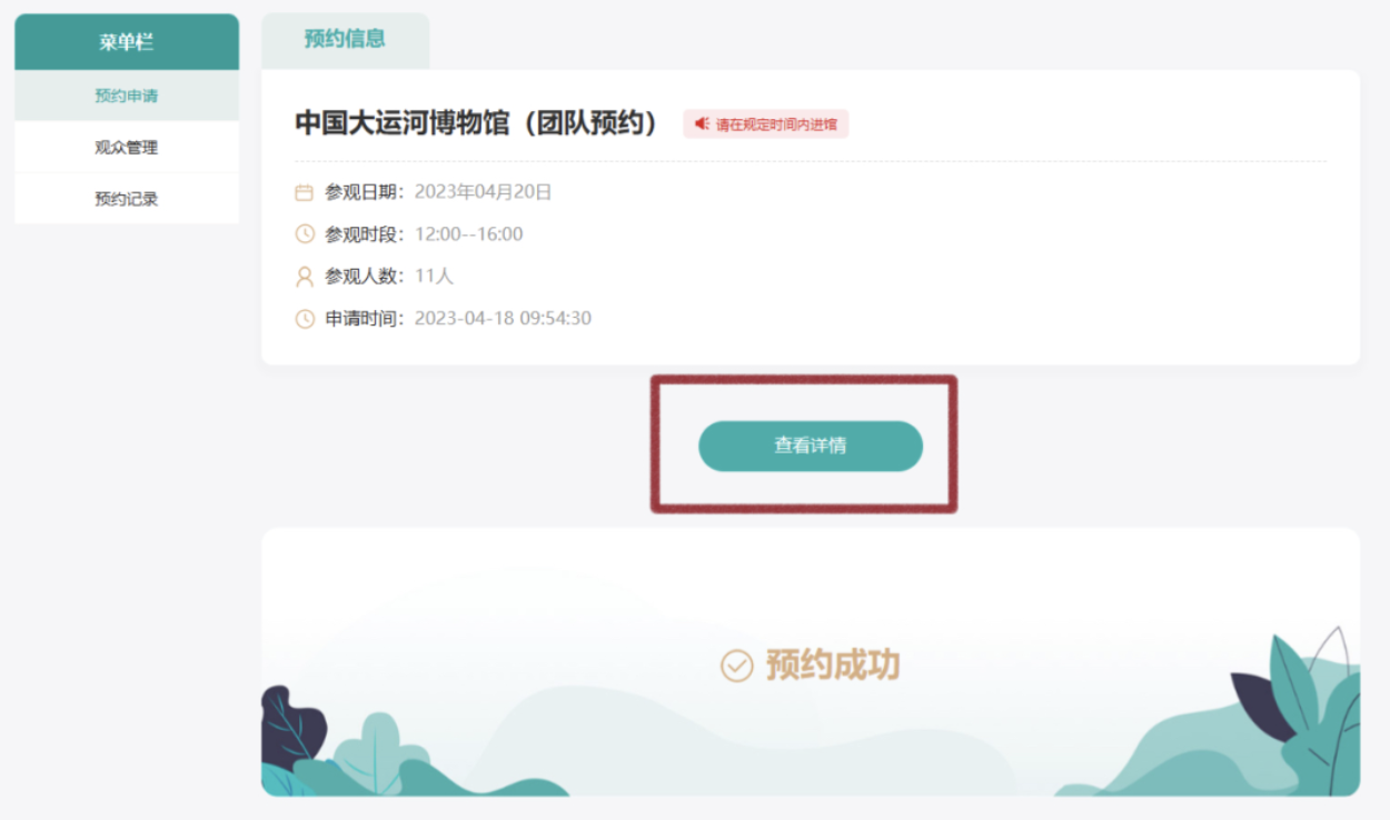 预约成功后,点击【查看详情】,就可以看见团队预约二维码,建议截图保存喔~到馆当天刷码就可以入馆啦。