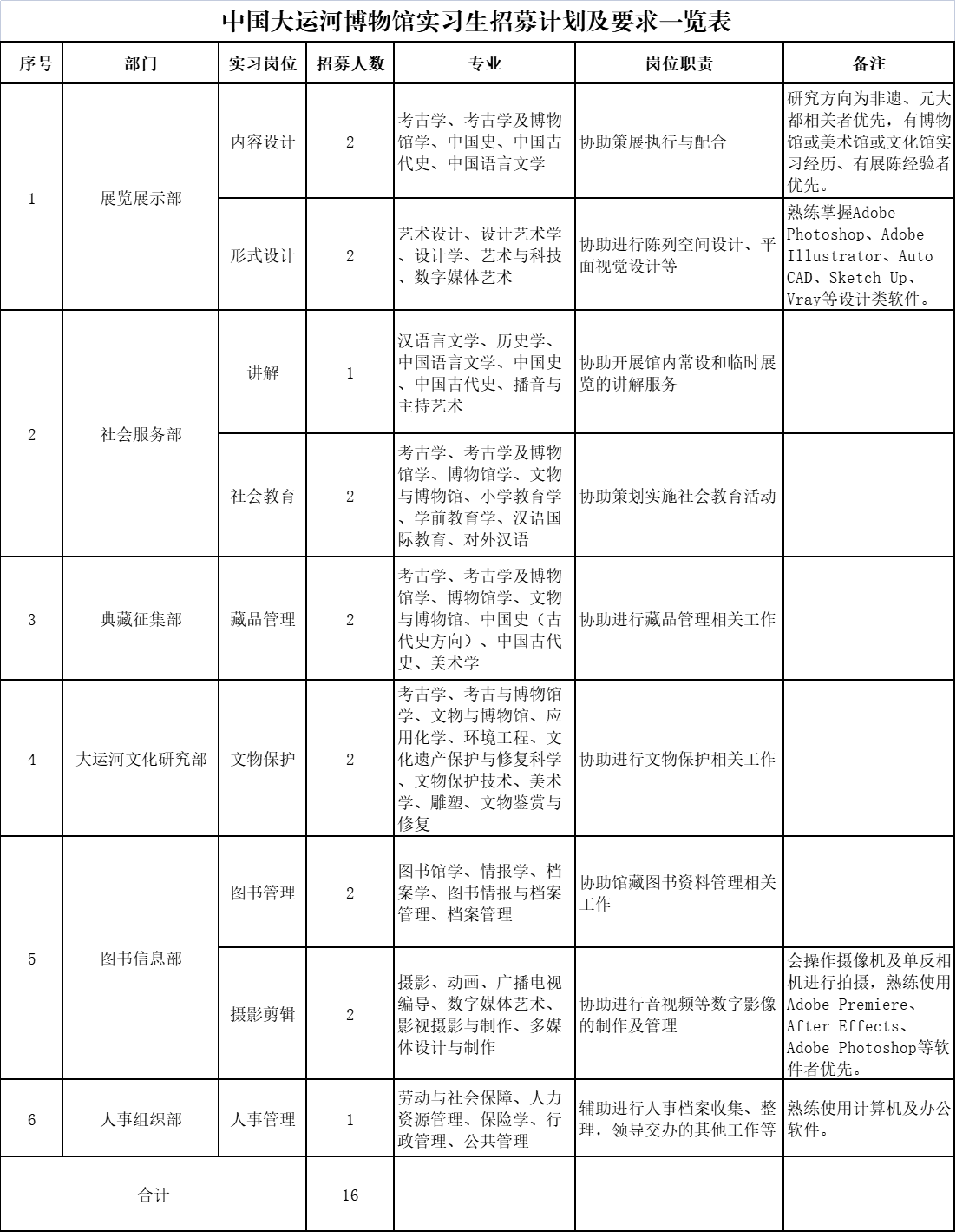 《中国大运河博物馆公开招募实习生的公告》(以下简称《公告》)发布以来,受到了全国各地青年学生们的热切关注与支持。为更好地承担人才培养的社会责任,为更多的在校学生提供了解博物馆运行的学习机会,除实习要求、实习待遇内容一致外,现更新《公告》部分内容如下: