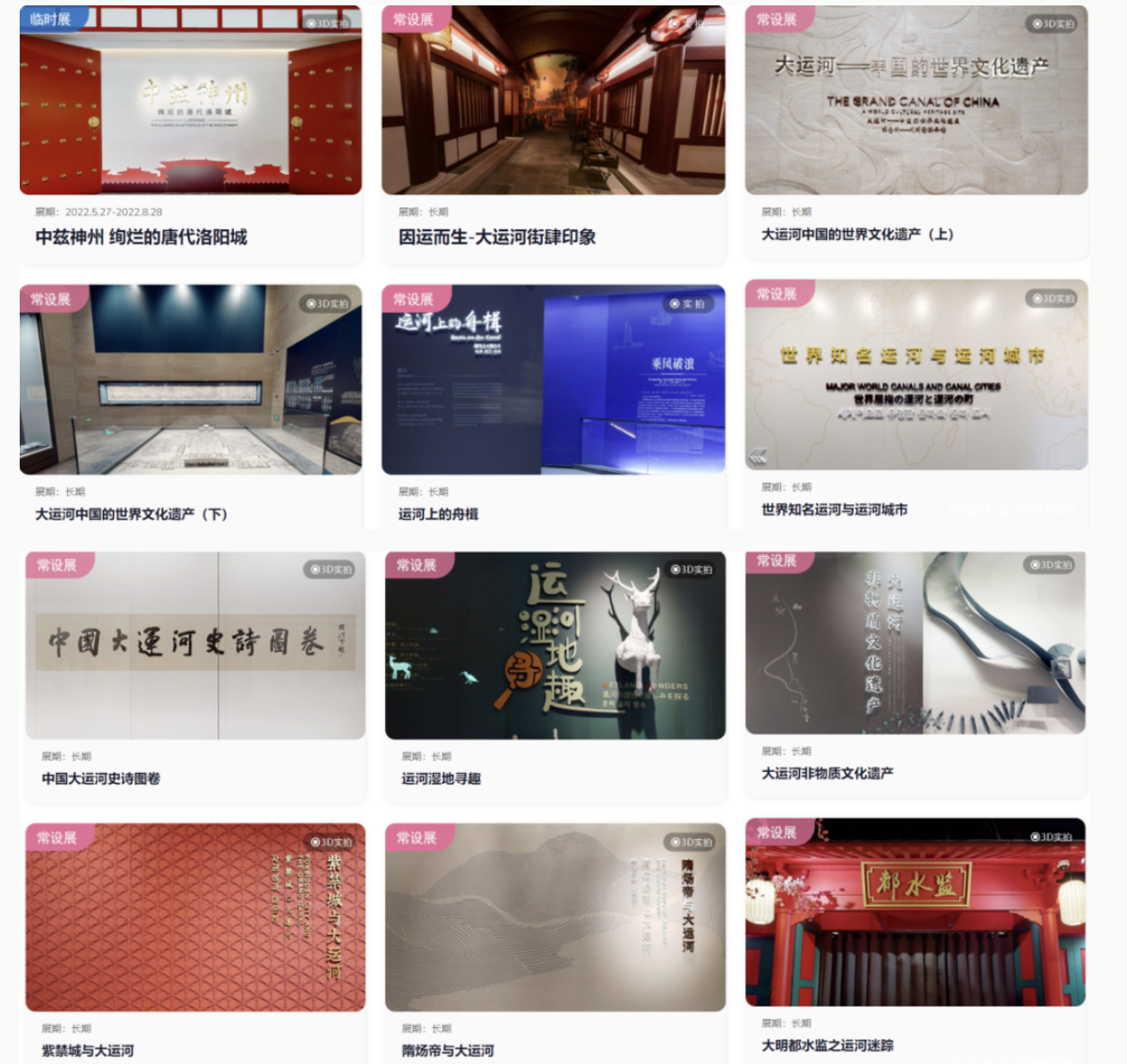 在中国大运河博物馆官方网站上,有一个特殊的板块——“展览”,即线上数字博物馆。目前板块中包括常设展“大运河——中国的世界文化遗产”“运河上的舟楫”“因运而生——大运河街肆印象”等,以及临时展“江都王”“中兹神州——绚烂的唐代洛阳城”“观妙入真——永乐宫的传世之美”等(其余临展将实时更新)。