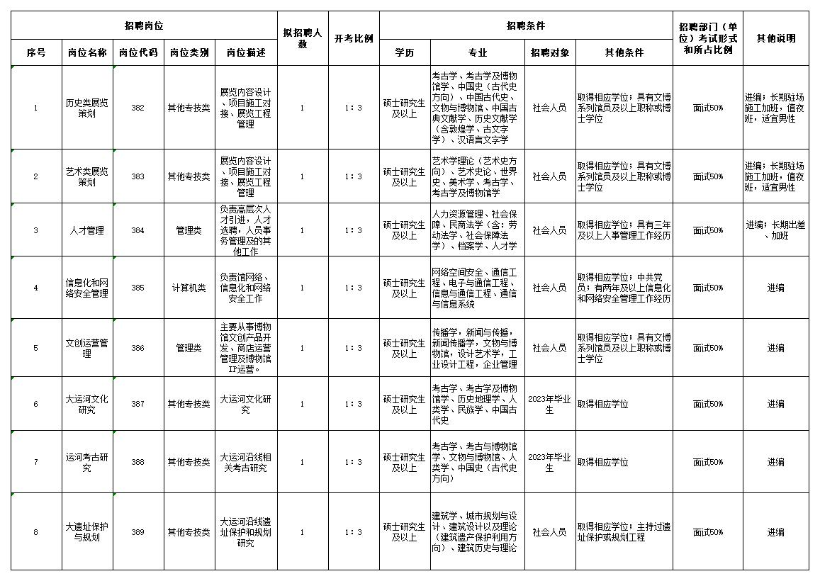 中国大运河博物馆,简称“中运博”,位于扬州三湾风景区,是集运河文物收藏、展示、研究、教育于一体,兼顾旅游休闲与对外交流的专题性博物馆,是大运河国家文化公园建设的标志性博物馆,是由江苏省文化和旅游厅直属管理的公益性事业单位。现因业务发展需要,根据《江苏省事业单位公开招聘人员办法》(苏办发〔2020〕9号)精神,向社会公开招聘8名工作人员。