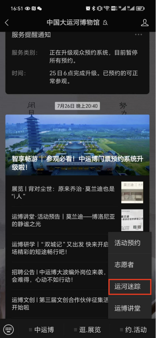 1.搜索“中国大运河博物馆”微信公众号,打开“约.活动”,点击“运河迷踪”,使用本人真实身份证进行实名预约。