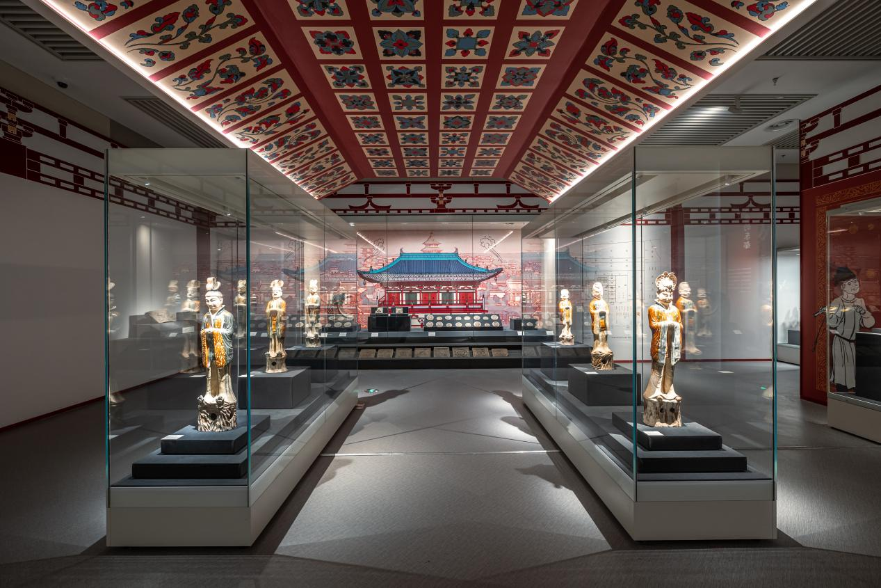 在展厅空间的设计前期,策展团队大量参考考古发现、唐代文献、壁画、绘画等史料,以确保设计的史实性,并打造鲜活生动的展厅空间。通过宫殿、里坊、佛像对展厅空间作了巧妙科学的划分,营造出空间的立体感。其中最大的亮点在于选用了与每部分展览主题相适应的色彩作为匾额和部题文字的底色,使观众一步入展厅便能从视觉感官上触知到展览主题。同时,展厅主色调选用赤红、素白二色,内饰天花藻井,辅以手绘线描图,还原了唐代洛阳城庄严厚重的一抹底色。