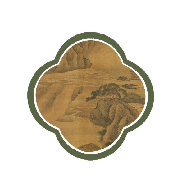 沉香亭是唐代皇家宫苑兴庆宫中的重要建筑,相传李白的名句“云想衣裳花想容”即作于此。《沉香亭图》以深远视角表现宫苑全景,楼台殿阁严整不苟,细致入微,给人以绮丽壮伟、雍容端庄之感。远山以烘染为主,少勾皴,表现出山体的肌理感,颇具奇幻险峻之势。