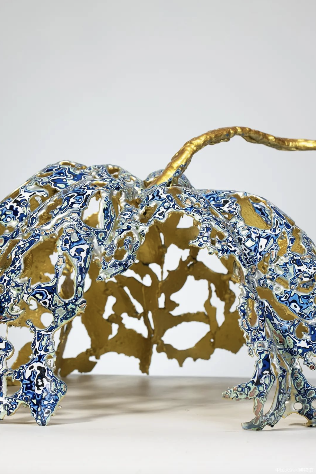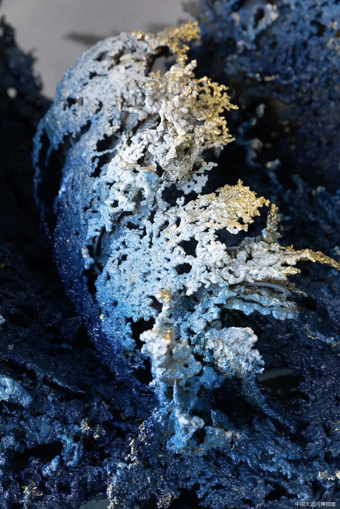 《千浪卷雪》就是用这样神奇的熔铜工艺完成的,滚烫的铜液泼出,瞬间凝固,就像浪花在卷起的瞬间凝结成冰。一片片“小浪花”经过组合焊接,再进行表面上色处理,成为了大自然灵动之美的永恒纪念。