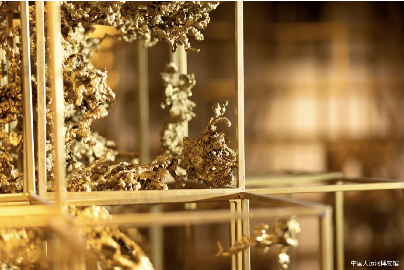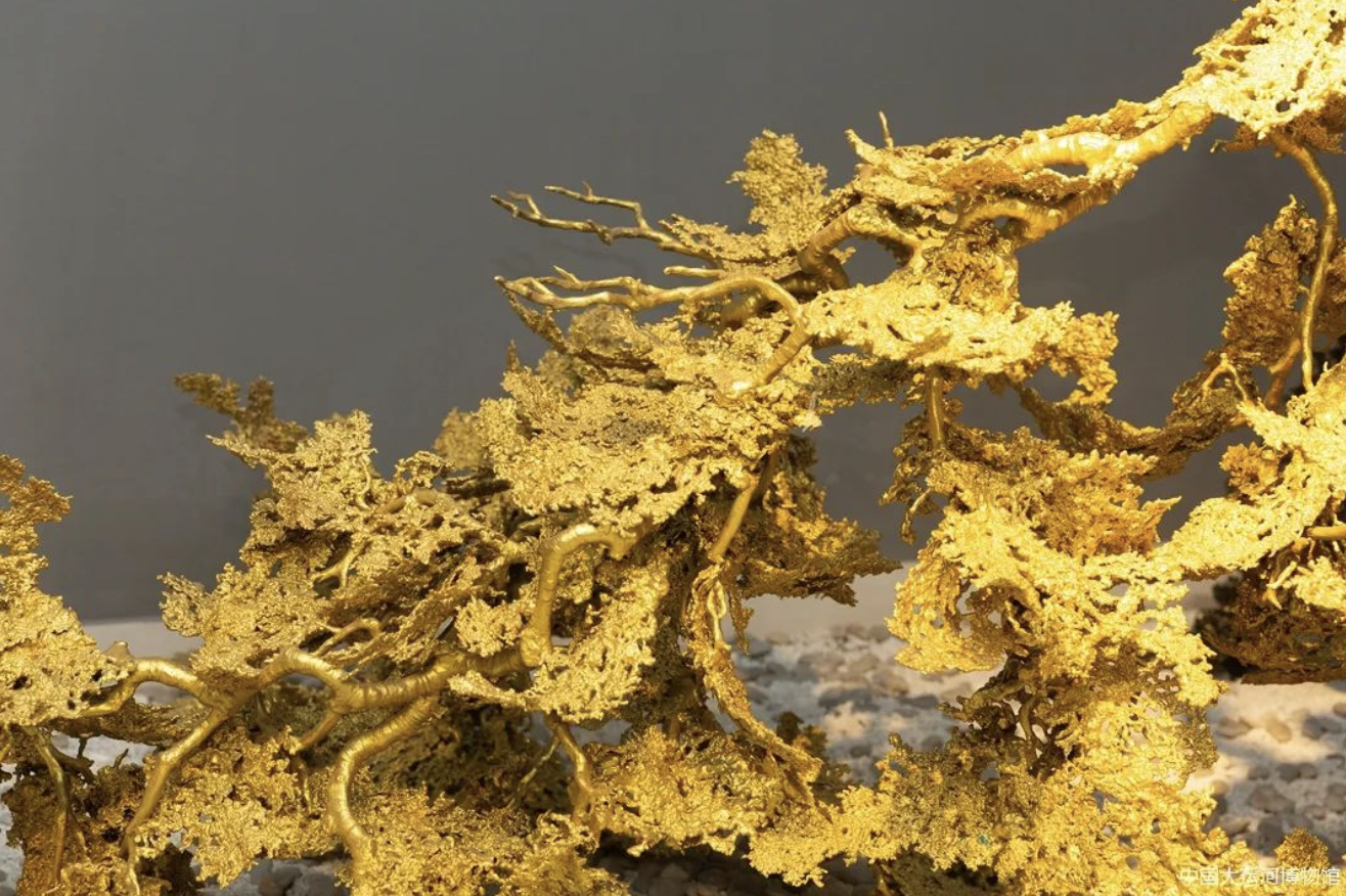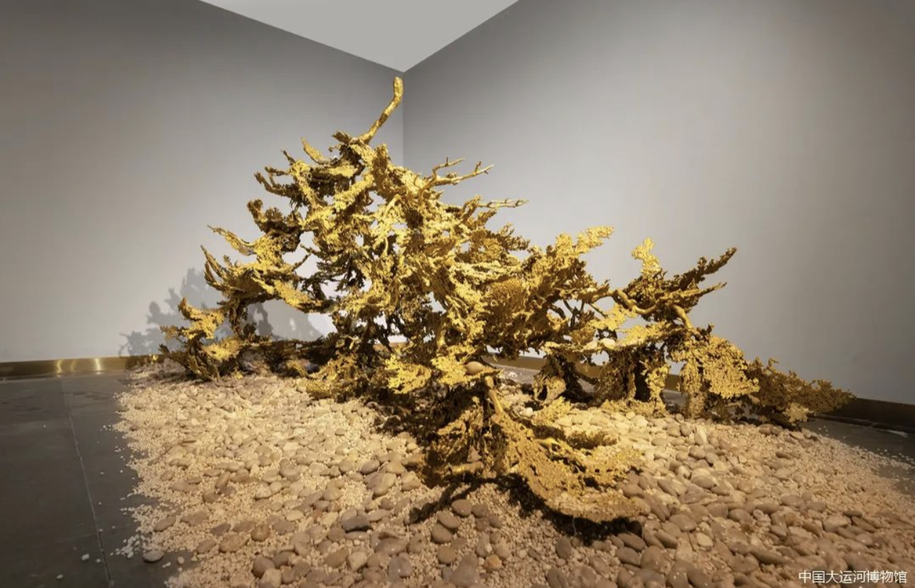 《地气》也是采用熔铜艺术制作,朱炳仁大师用写意的表达方式跳出传统的囹圄,倒置的树枝上缀满金黄的熔铜“树叶”,像是在诉说着自己的祈盼。