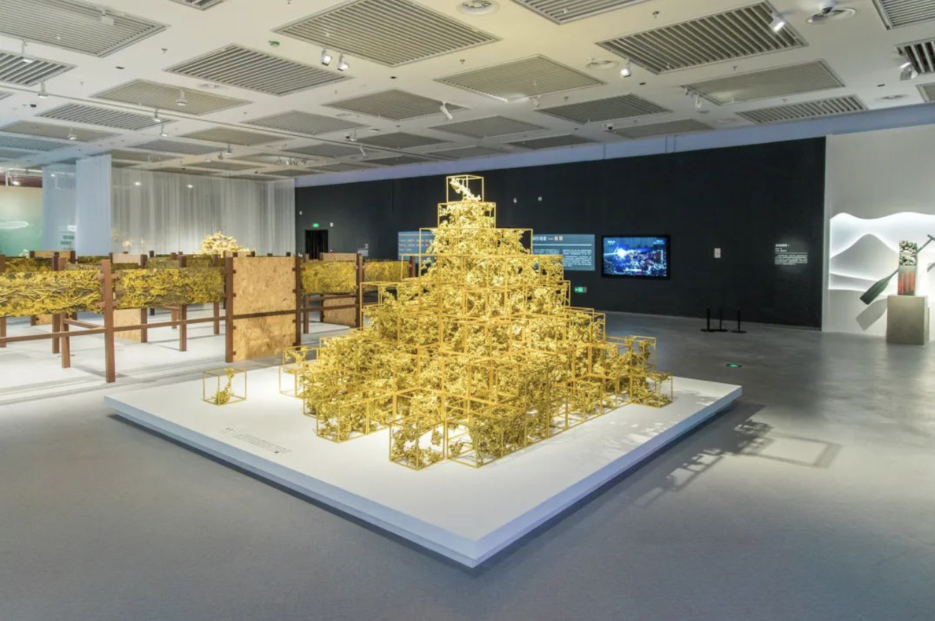 《重生》采用G20峰会主会场铜装饰边料制作而成,将山水形态的熔铜内置在立体框架中,随机的熔铜与有规律的几何框架相结合,象征现代城市与山水融合,也象征铜的“重生”。