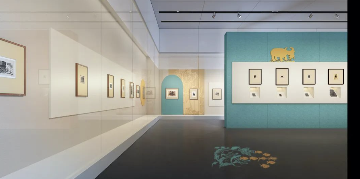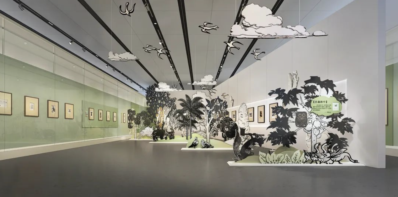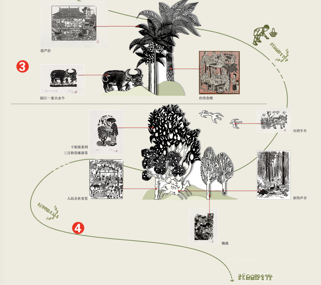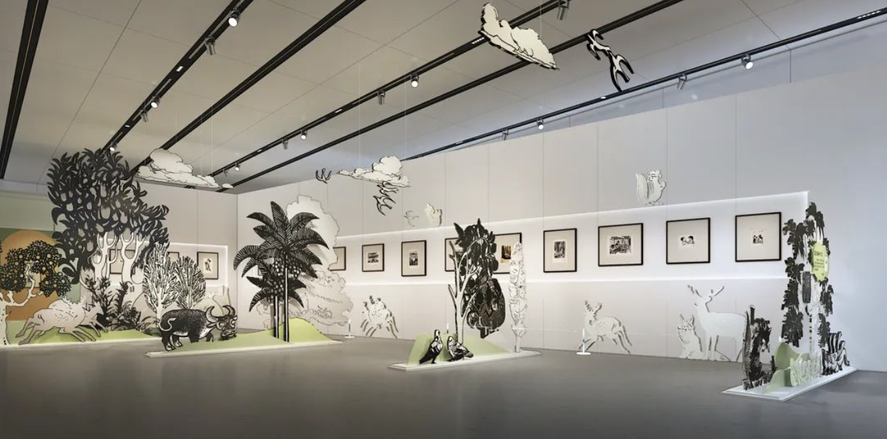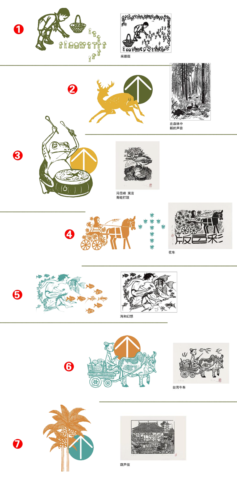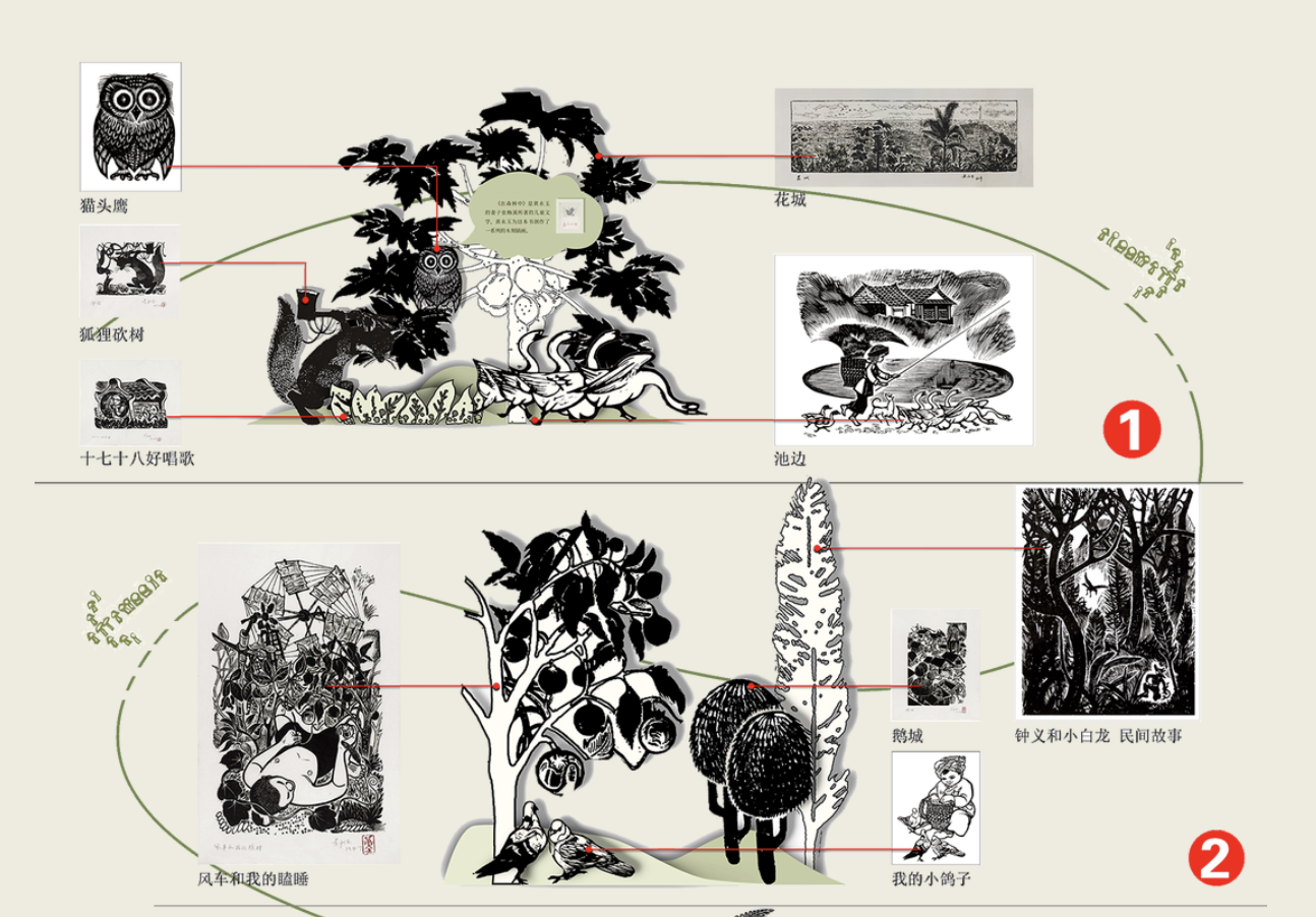 我们选取黄老版画作品中的元素,形成层次分明的视觉效果,令观众能够沉浸式体验黄永玉版画艺术作品中意趣横生的森林世界。你找到它们的出处了吗?