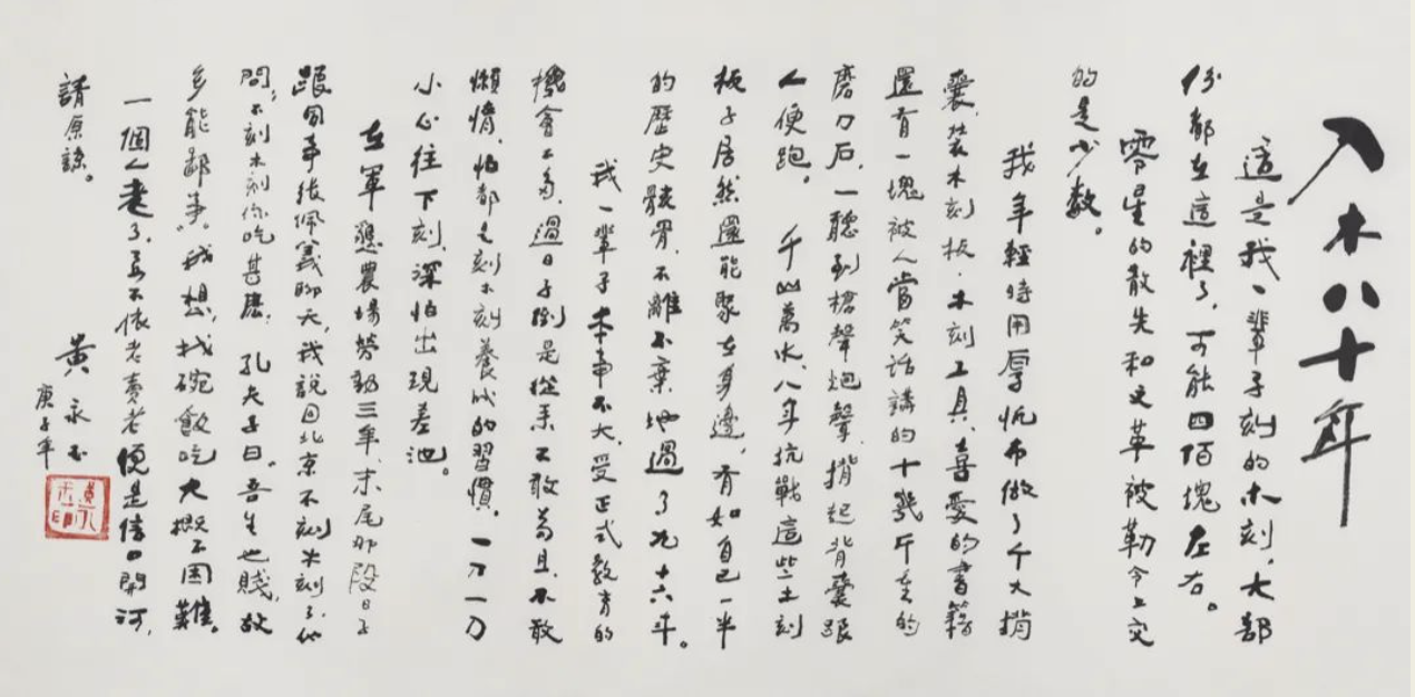百岁期颐,黄老刀下所刻的,正是他生命里的所有。八十年来,他将内心不变的淳朴、天真与对人生的希冀、欢愉凝于刀刃,刻下一件件饱含岁月沧桑的艺术珍品。黄老在保留中国传统版画艺术精华的同时,又融入漫画及西方多种艺术语言,以此进行探索实践,拓宽了中国新兴木刻的审美与维度,使版画在新中国的转型中显现出时代的高光,更让世界领略到中华传统木刻版画艺术历久弥新的魅力。