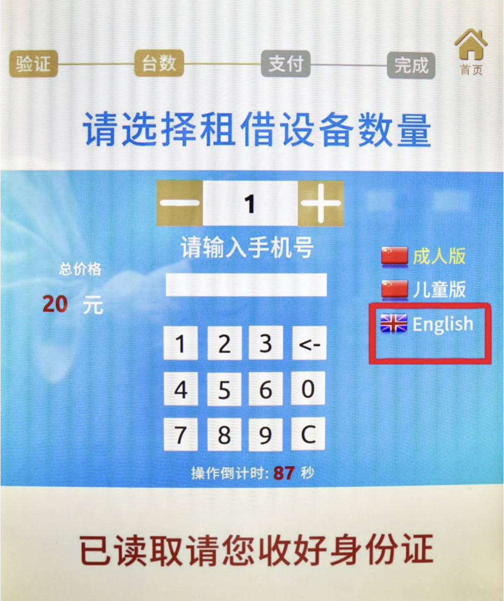 在屏幕上点击“English”,选择台数,输入手机号码,点击“支付”扫码付款。