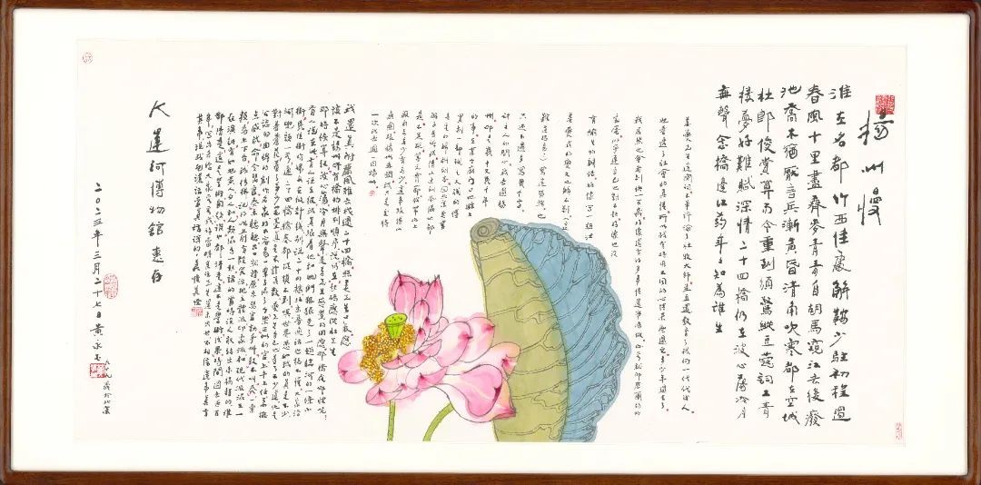今年一百岁的黄永玉先生专门为此展创作了画作《扬州慢》,画作中部是黄老最爱的荷花,在红荷碧叶间有766字,以姜夔的《扬州慢》开篇,“淮左名都,竹西佳处,解鞍少驻初程……”,其后娓娓道来,讲述黄老几十年前来扬州的经历:在扬州某个庙门口地摊上买到一部残之又残的刻本,又称自己附庸风雅去找过二十四桥,然而狠狠走了一趟,却连二十四桥桥基都捉摸不到。