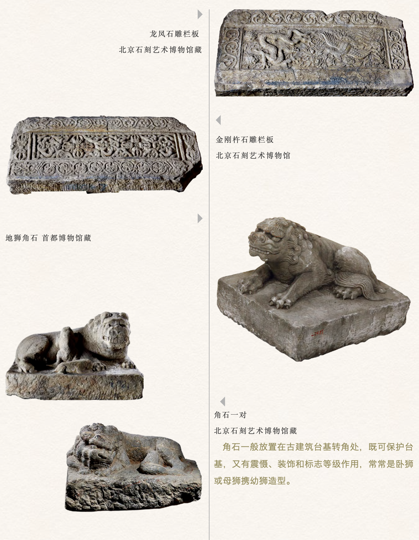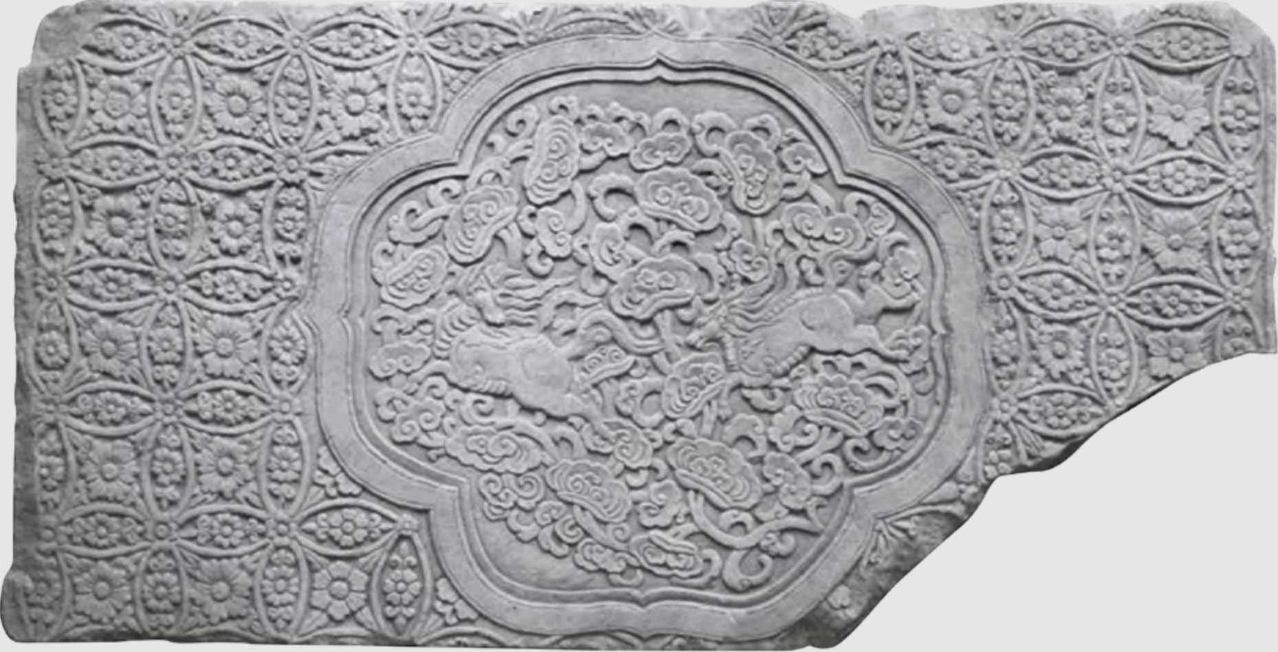 北京地区出土的石构件较多,主题纹饰有走龙、莲花瓣、宝相莲瓣等,此件主题纹饰为灵芝、麒麟,姿态生动, 虽然残缺,仍能显示出元代雕刻工艺的高超水平。