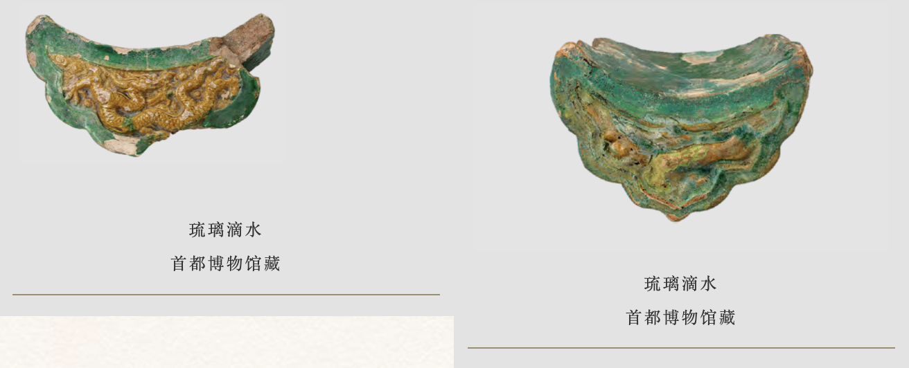 元代高等级建筑使用的龙纹瓦当、滴水,在元大都、元中都、元上都都有不少发现,其中以黄绿琉璃最为常见,也见有蓝绿黄琉璃。元人尚白,考古也曾发现白色瓷瓦或琉璃瓦。发现数量更多的是灰陶瓦件。元大都出土的瓦当、滴水,以花草纹、凤鸟纹、兽面纹为大宗。