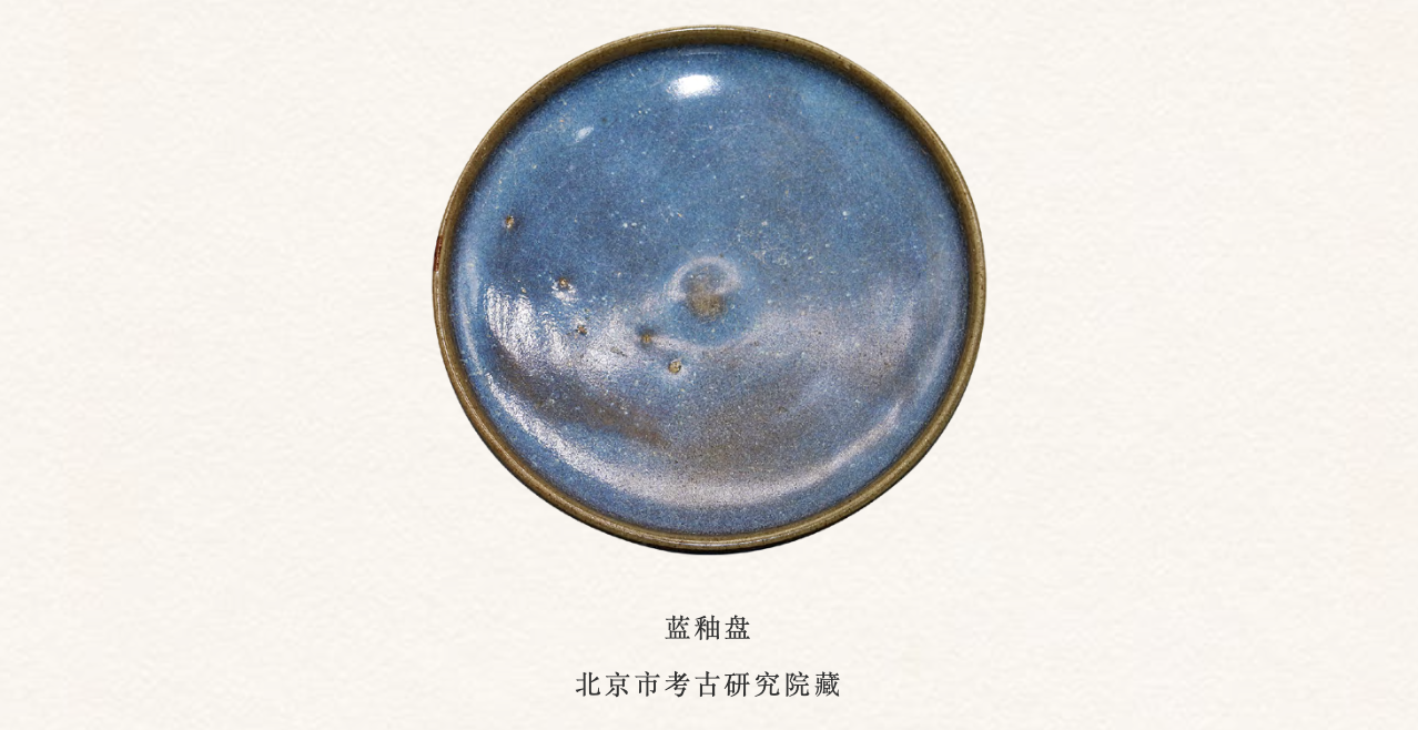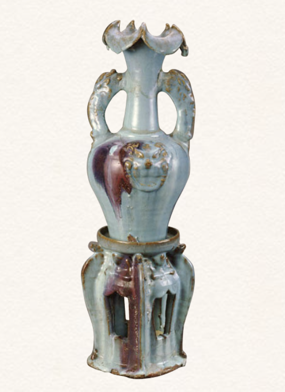 元大都发现了不少钧窑瓷器。其中,后桃园遗址出土的这件钧窑天蓝釉贴花兽面纹连座双耳瓶,器形高大,装饰精致,艳丽的紫红斑形成绚丽的色调,是元代钧窑瓷器的代表作。