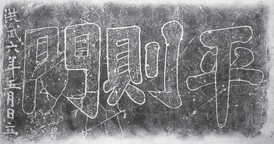 平则门石额拓片,北京石刻艺术博物馆藏。石额为青白石质地,双钩正书“平则门”三字,是北京现存最早的城门石额。平则门是元大都外城西城墙南侧的城门。