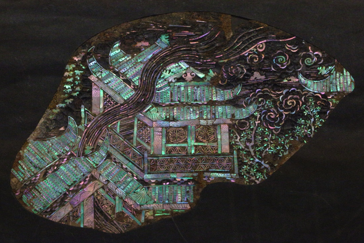 元大都后英房遗址出土嵌螺钿广寒宫图漆器残片,首都博物馆藏。残片的正中为一座两层三间重檐歇山顶楼阁,阶梯和勾栏等物俱存。一道云气贯穿画面,自楼阁下层腾起,掠过楼顶,直冲霄汉。因出土碎片中有“广”字残迹,所以一般认为该残片所描绘的是广寒宫场景。这件制作精彩的漆器残片,除了见证元代漆器工艺的发展,也为我们感受元代建筑提供了极佳的材料。