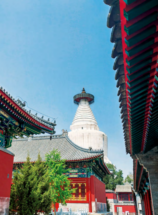 在衙署之外,则分布着寺观、民居等建筑。赵孟頫在城中的交游,让他对大都城内的建筑也不陌生。这些建筑与赵孟頫此前生活的杭州、湖州不同,有着鲜明的北方特点。其中十分吸引赵孟頫注意的,是忽必烈下令兴建的皇家大寺——大圣寿万安寺,这也是元大都城内的第一座皇家大寺。寺院中最核心的建筑是覆钵式的释迦舍利灵通之塔,由尼泊尔工匠阿尼哥设计建造。赵孟頫所目睹的这些刚刚兴建的繁华大都中的建筑,折射出了蒙元时代的风采。