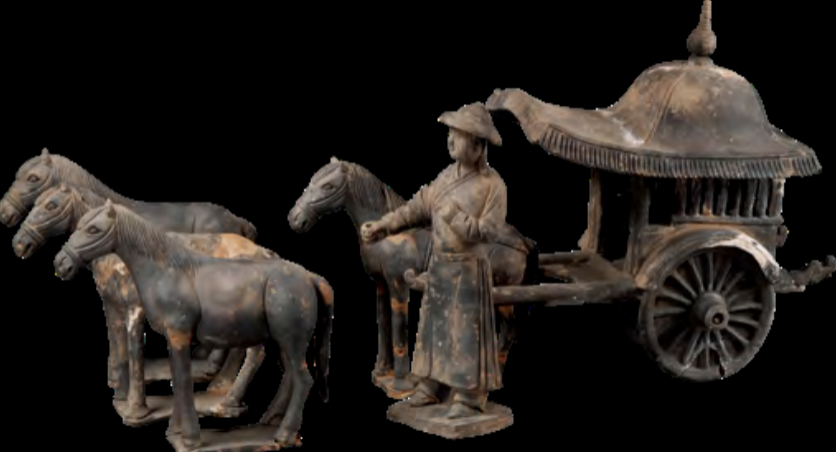 驭车马陶俑组合,2009 年陕西省西安市长安区刘黑马家族墓 M16(刘元振夫妇合葬墓)出土,陕西省考古研究院藏。四马一车配置,驭手蒙古装束,立于马车旁,屈肘虚拳呈牵引状。