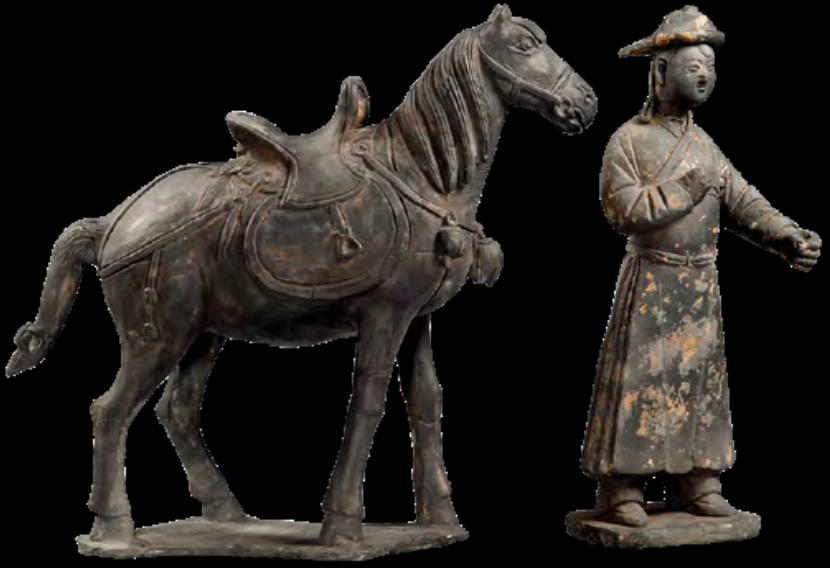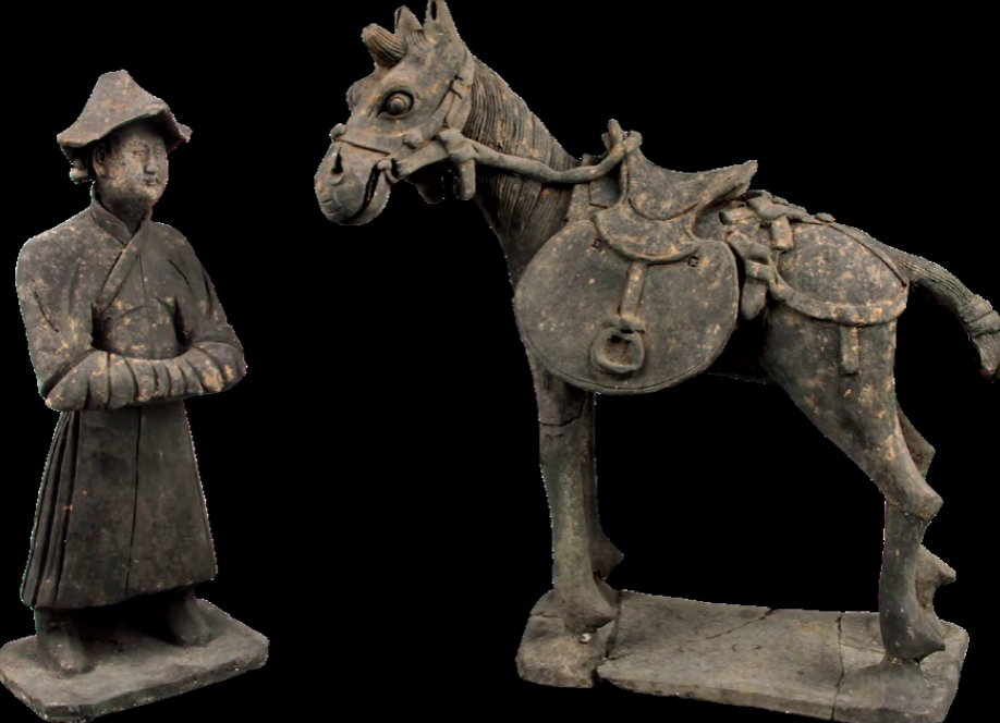 牵鞍马灰陶俑组合,2009 年陕西省西安市长安区刘黑马家族墓 M16(刘元振夫妇合葬墓)出土,陕西省考古研究院藏。