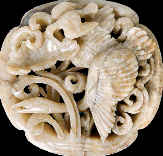 白玉透雕春水图佩饰,中国大运河博物馆藏。两只天鹅头大圆眼,张口嘶鸣,细颈曲伸,身躯肥硕,展开双翅逃离;海东青呈展翅俯冲状,小头圆眼,尖喙内勾。雕刻细腻,生动逼真,是元代春水玉的代表作品。
