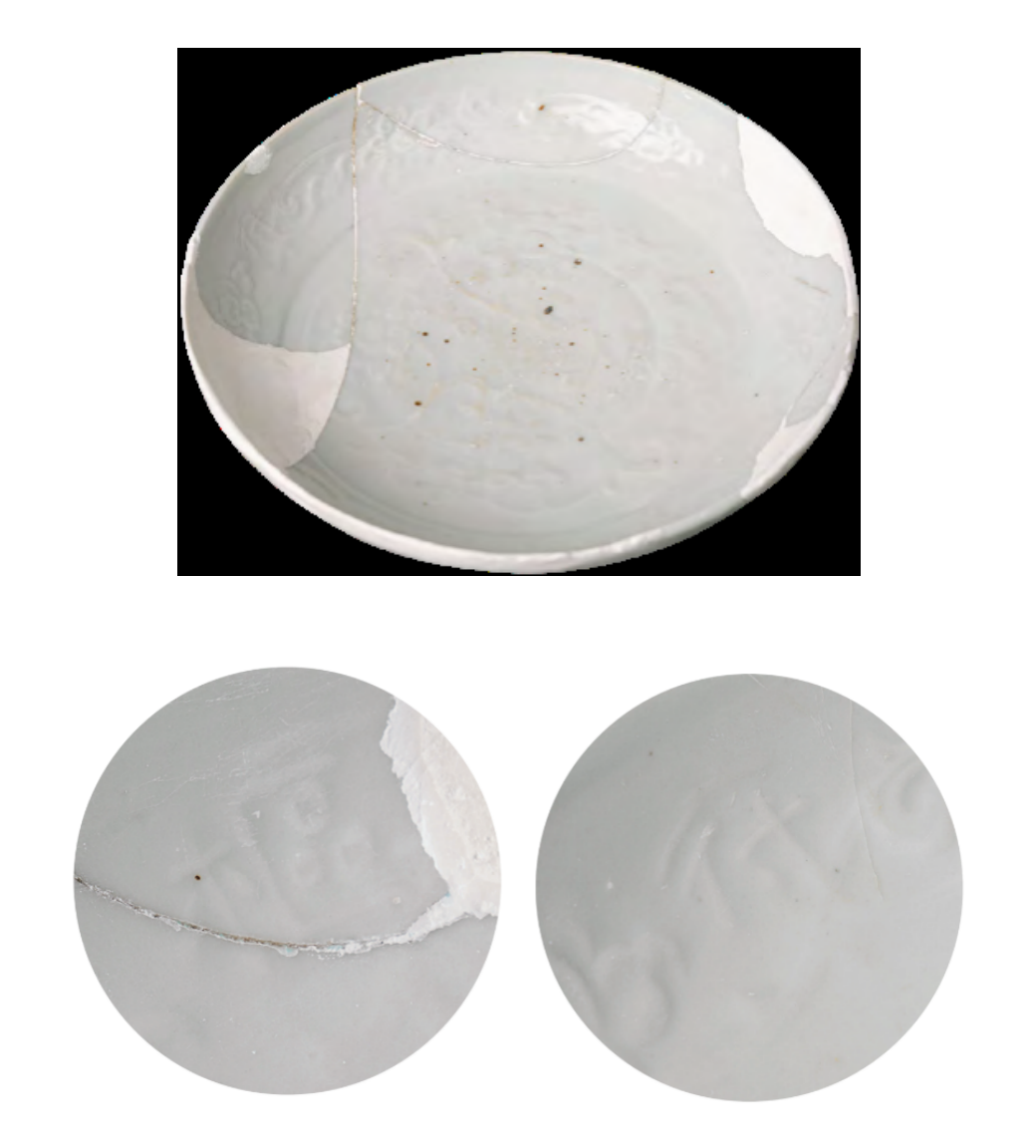卵白釉模印“枢府”款花卉纹盘,中国大运河博物馆藏。盘内模印缠枝莲花纹饰,内壁腹部花间相对印“枢”“府”二字。“枢府”一般指元代最高军事机构枢密院,从现有考古材料看,印有“枢府”款的卵白釉瓷既有供官方用瓷,也作为商品在民间流通。