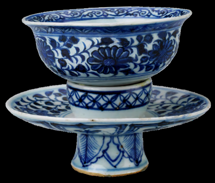 青花花卉纹盏托,1970 年北京市西城区旧鼓楼大街豁口元代窖藏出土,首都博物馆藏。盏托为一套茶具,其上绘出卷草、花卉等纹样。