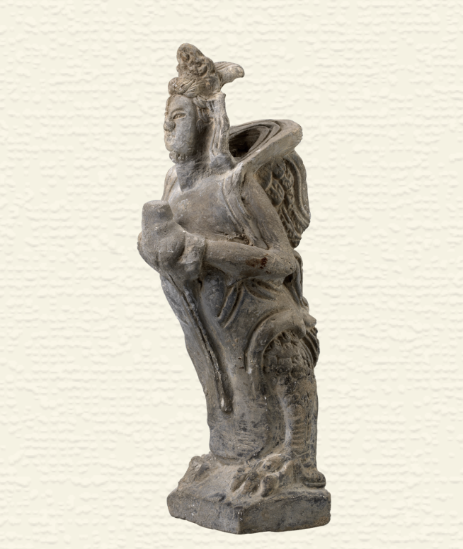 这是建筑装饰。人鸟结合,头部、躯干为人形,后生双翼,身体下部为鸟形。迦陵频伽(梵语音译)为佛教中一种鸟神,传说生于雪山,在蛋壳中即能鸣叫,其音和雅,听者无厌,故又名妙音鸟。迦陵频伽在《营造法式》一书中作“嫔伽”,屋檐转角处的嫔伽成为高等级建筑上常见的装饰部件。