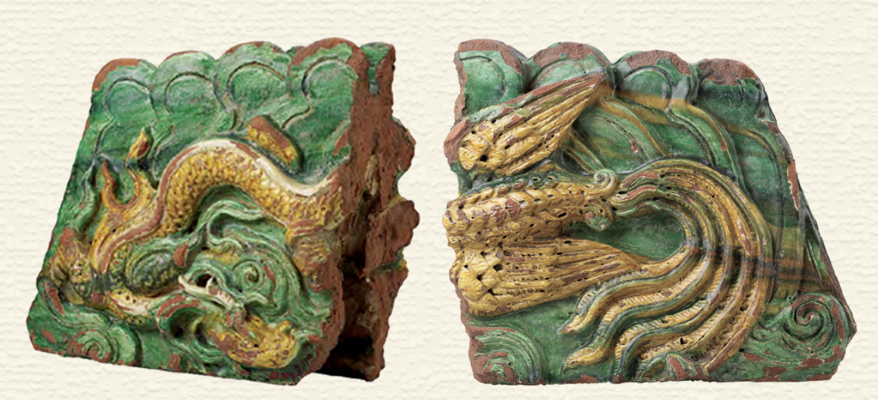 拆除明代北京城垣时发现的元代琉璃脊饰残件,为黄绿两彩,前后两面均施釉,从此残件看,当是一面雕龙,一面雕凤,推测是鸱吻的局部残件。