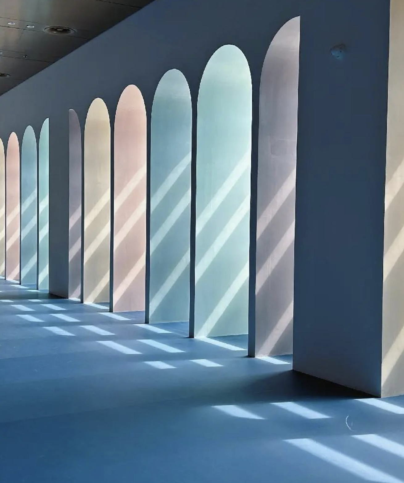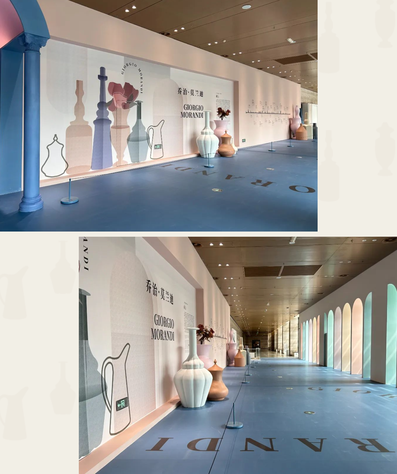 展厅外是一整面的连绵不断的拱廊,光线透过莫兰迪色的拱门,投射出有节奏感的阴影,不同时间拱门的颜色也会产生微妙的变化哦。