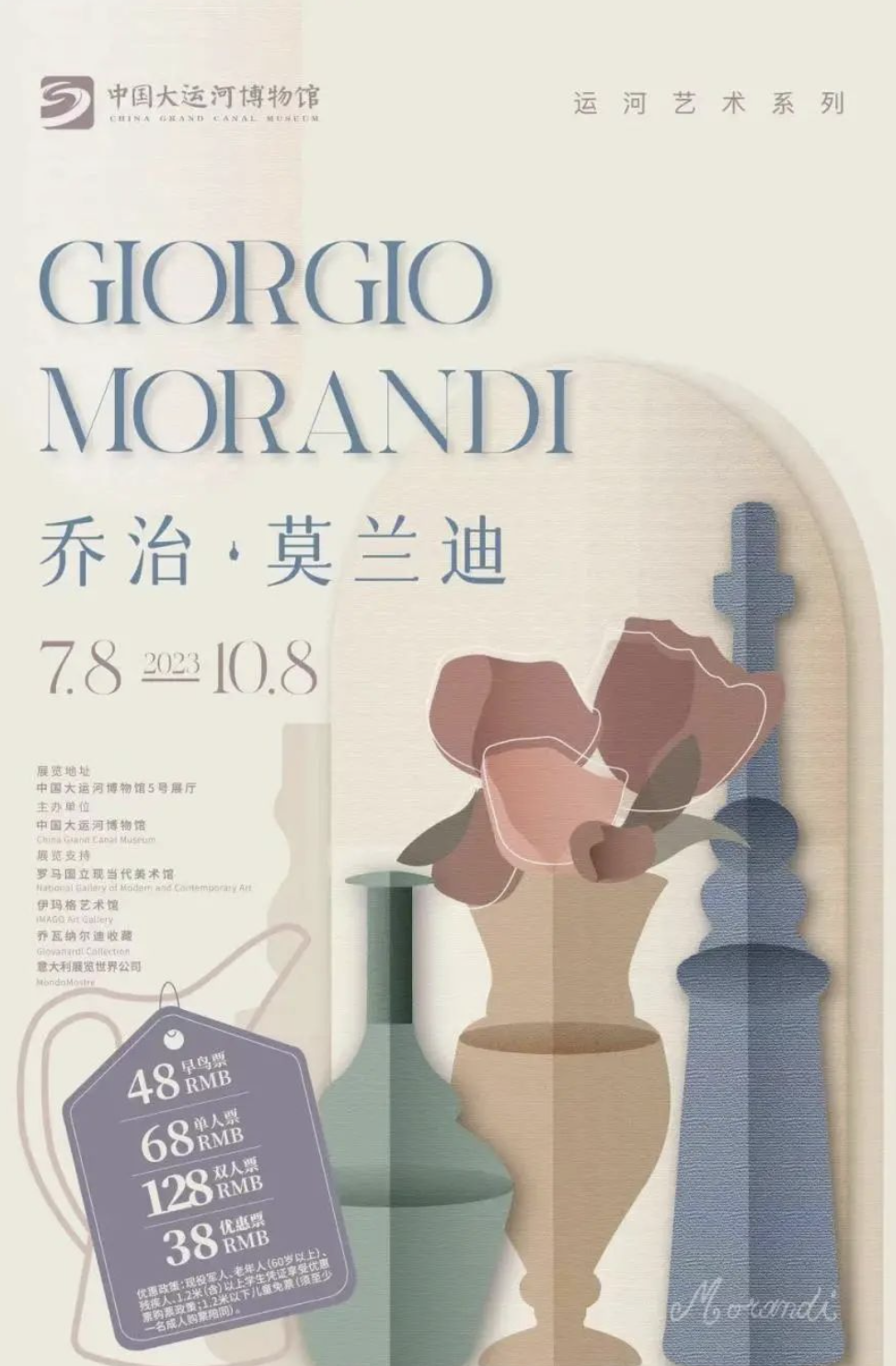 2023年7月8日—10月8日,中国大运河博物馆携手意大利罗马国立现当代美术馆、伊玛格艺术馆以及乔瓦纳尔迪收藏,推出年度艺术大展“乔治·莫兰迪”,为观众呈现莫兰迪这位孤寂的意大利画家与其瓶瓶罐罐厮守的一生。