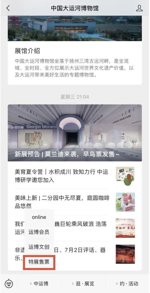 在中国大运河博物馆公众号“中运博”板块内选择“特展售票”。