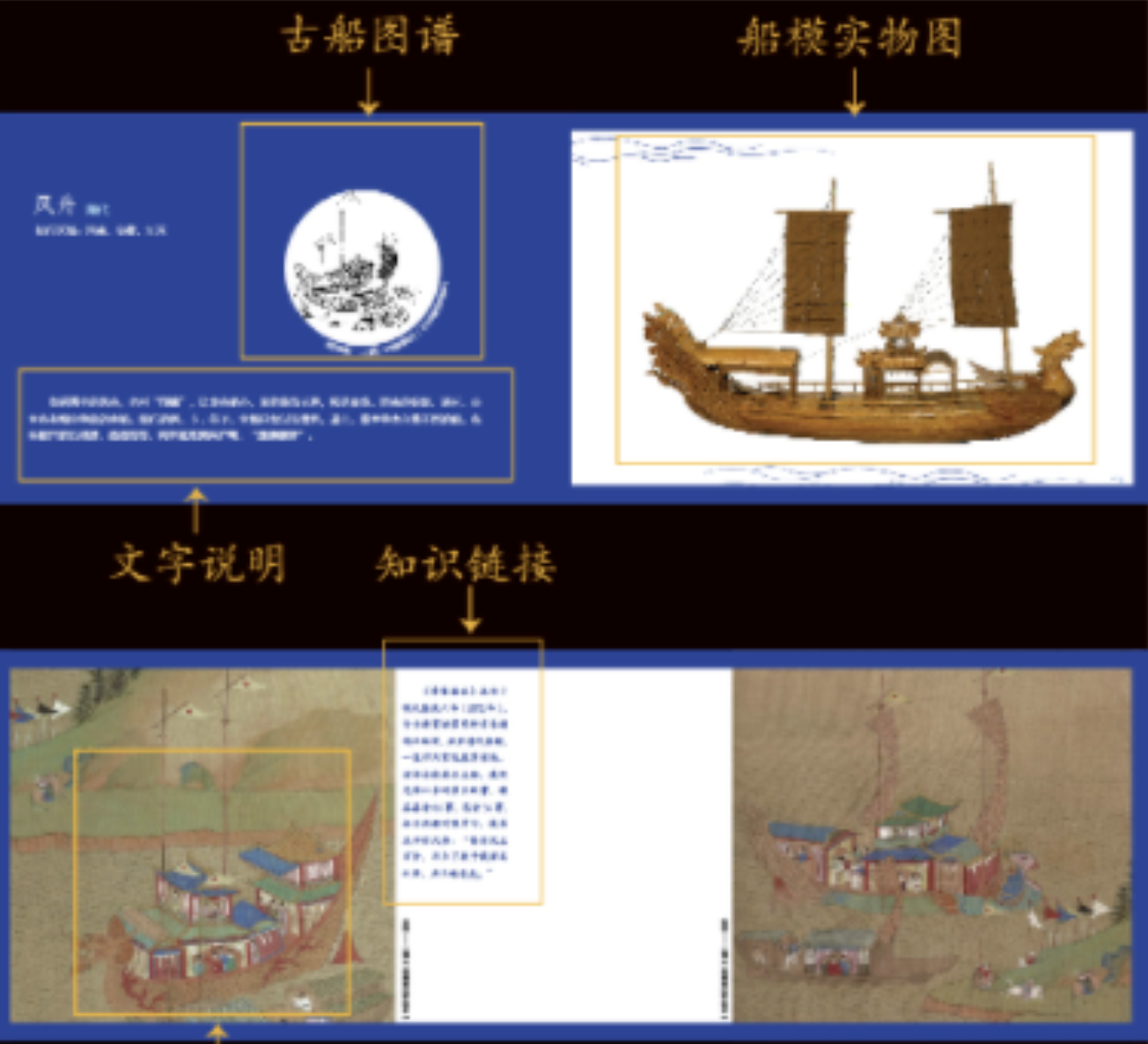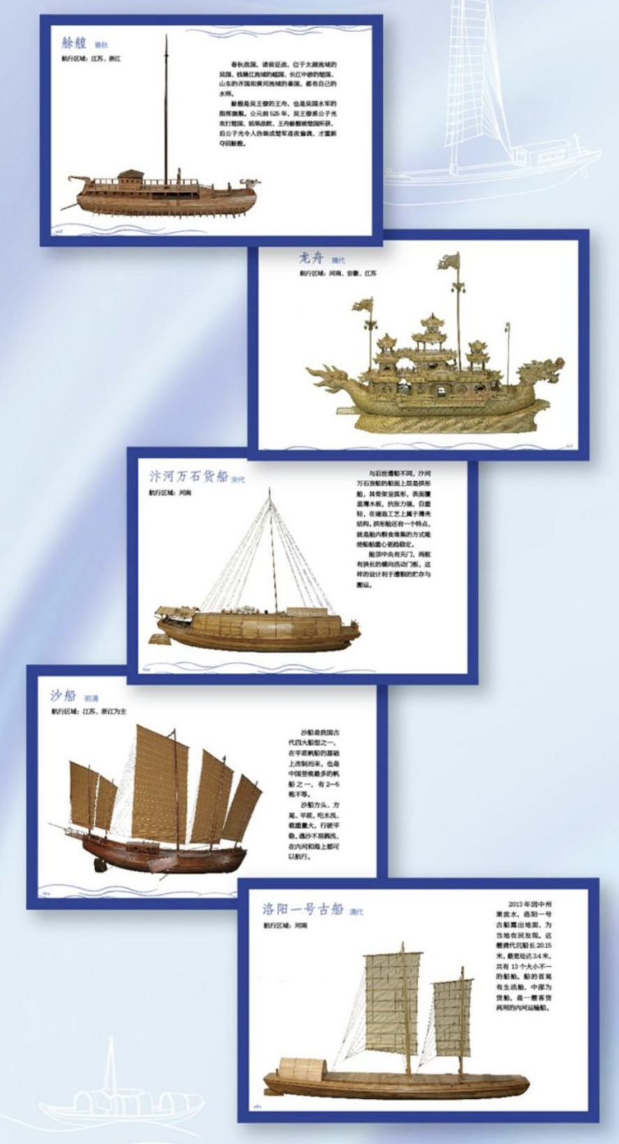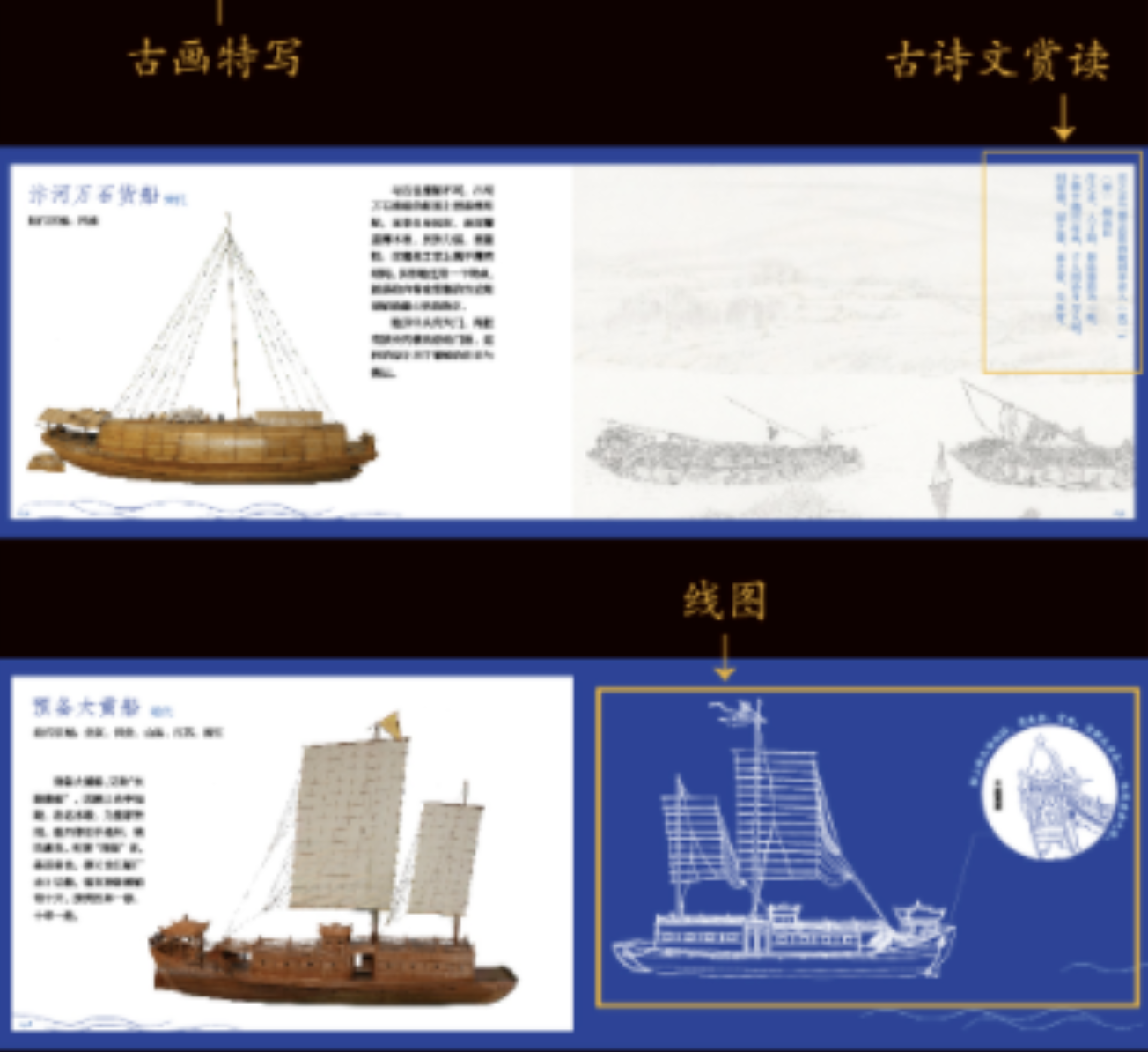 图书设计精巧、元素丰富。内容涵盖船模实物图、线图和文字说明、古船图谱、古画特写、古诗文赏读和运河知识链接,编排时既关注知识传播,又强调艺术呈现,是一本好看又有趣的运河舟楫小图册。