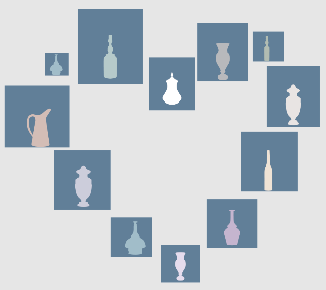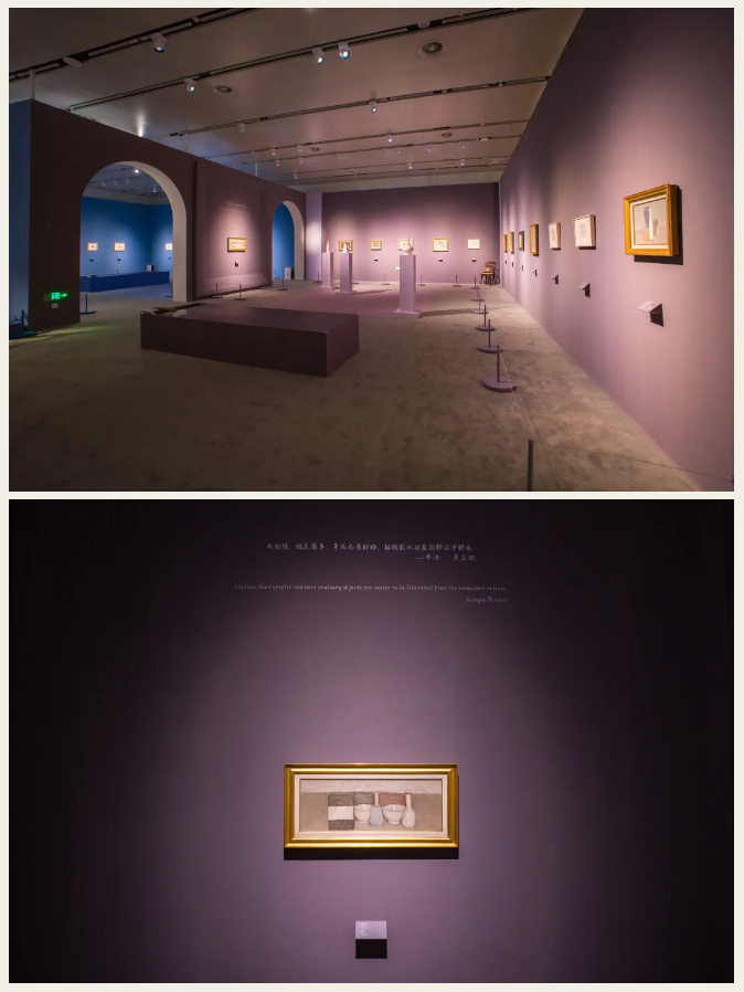 展厅内部墙壁颜色就选取于莫兰迪色系,第一单元的蓝选自于莫兰迪画作《景观Landscape》。相较于湖蓝、宝蓝等常见亮色系,莫兰迪蓝让人彷佛置身于在大海的深处,静水流深,闻喧享静。