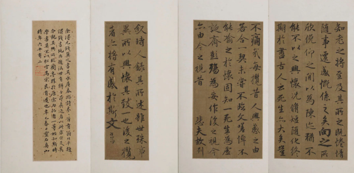 赵孟頫的楷书与唐代颜真卿、柳公权、欧阳询并称“欧、颜、柳、赵”。其楷书融唐铸晋,既端庄朴实,又流畅婉丽,形成独特的体势,获“赵体”之称。正如这幅他在北上大都所作《兰亭十三跋》并临写《定武兰亭》书迹,被清人安岐评云:“谛观文敏诸跋并序,实赵书中奇品。”