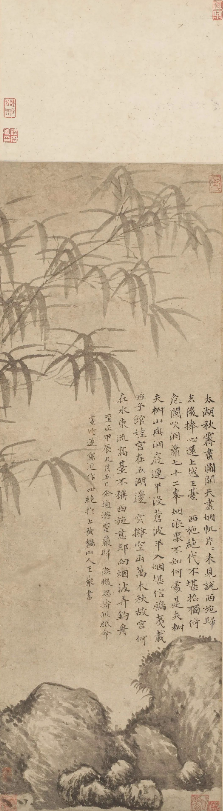 王蒙与黄公望、吴镇、倪瓒合称为“元四家”,作品传世以山水为多,而墨竹绝少,这幅《竹石图》当为之一。图绘竹一枝斜出,似为沉烟沐雨之状;地坡湖石一曲,缀以杂草,淡墨皴擦、浓苔提醒,可谓秀润之致。