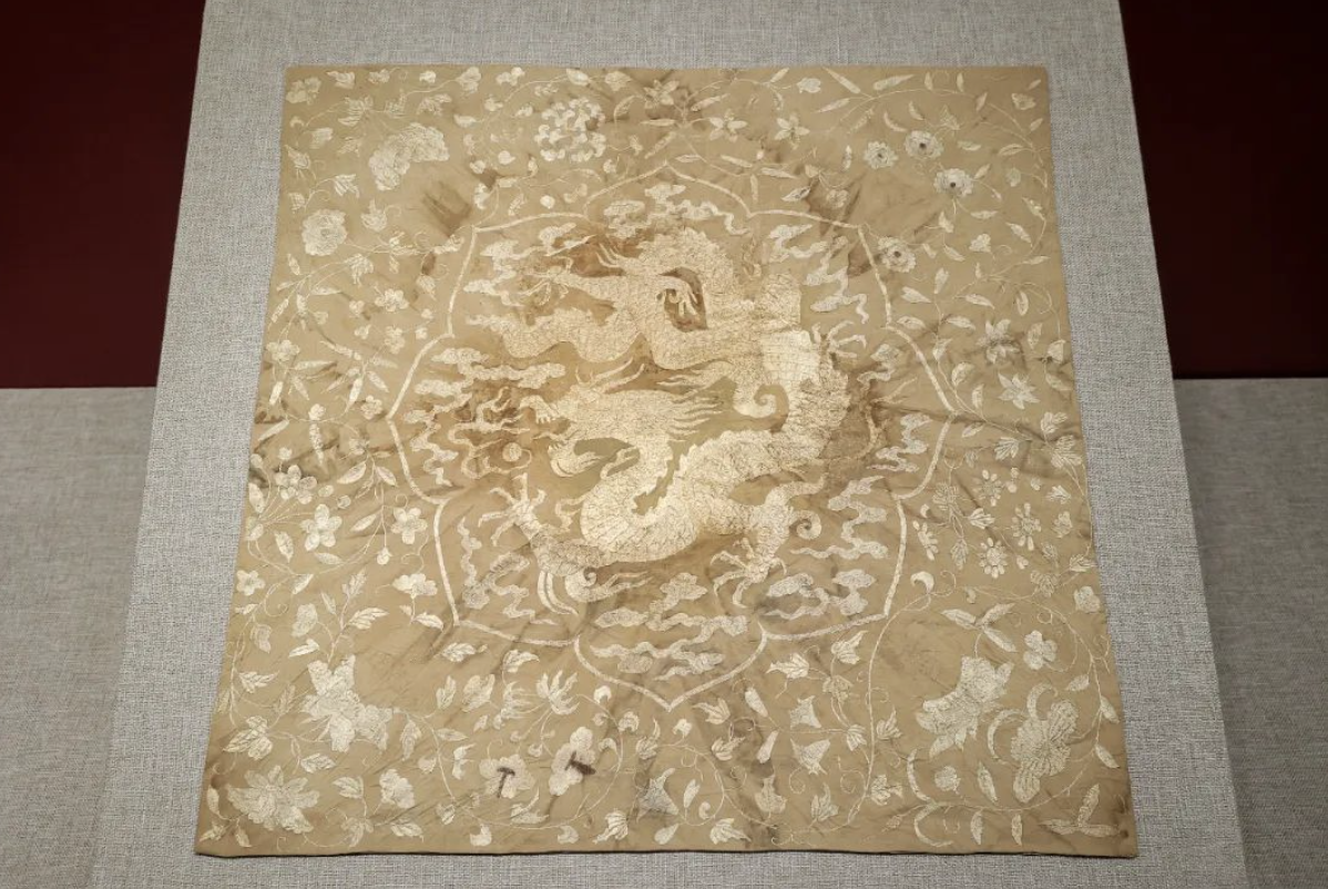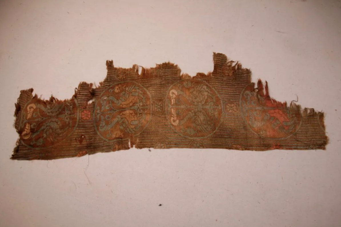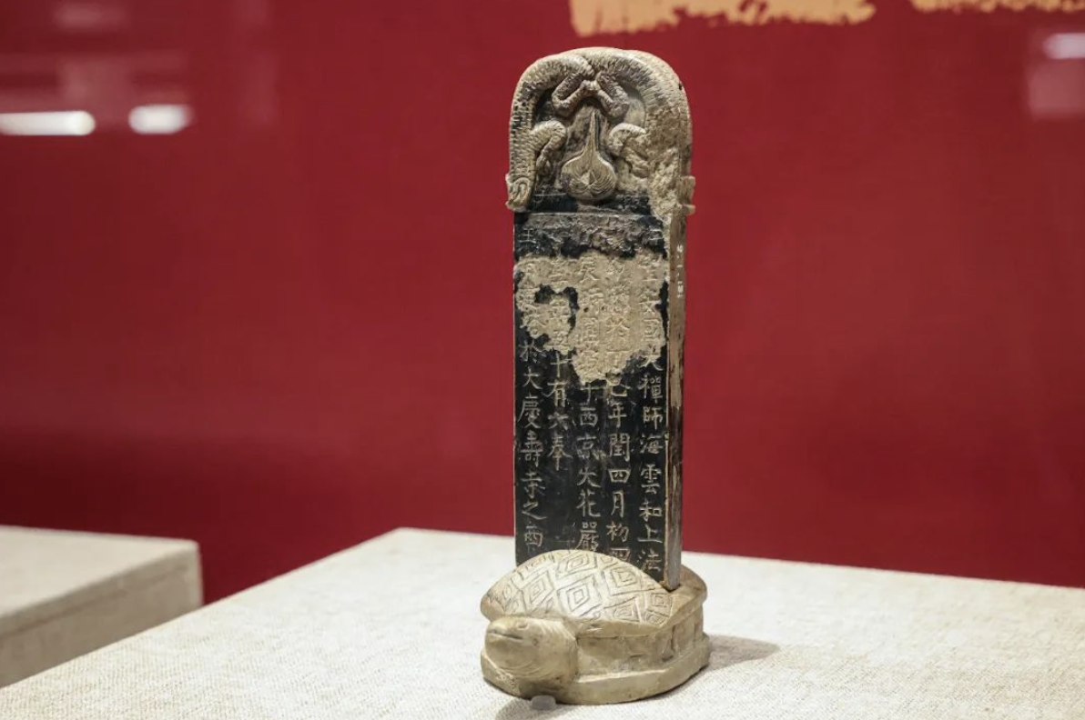 以上两件文物皆出自双塔庆寿寺海云禅师灵塔内。海云,临济宗第16代祖师,忽必烈曾两次召他询问治国之道。上部小石碑石质软脆,面涂黑漆,下有龟蚨,志石双面各刻字五行述其生平。下部刺绣“香花供养”云龙纹包袱用于包裹海云的骨灰匣,据推测供奉者可能是蒙古皇室权贵。