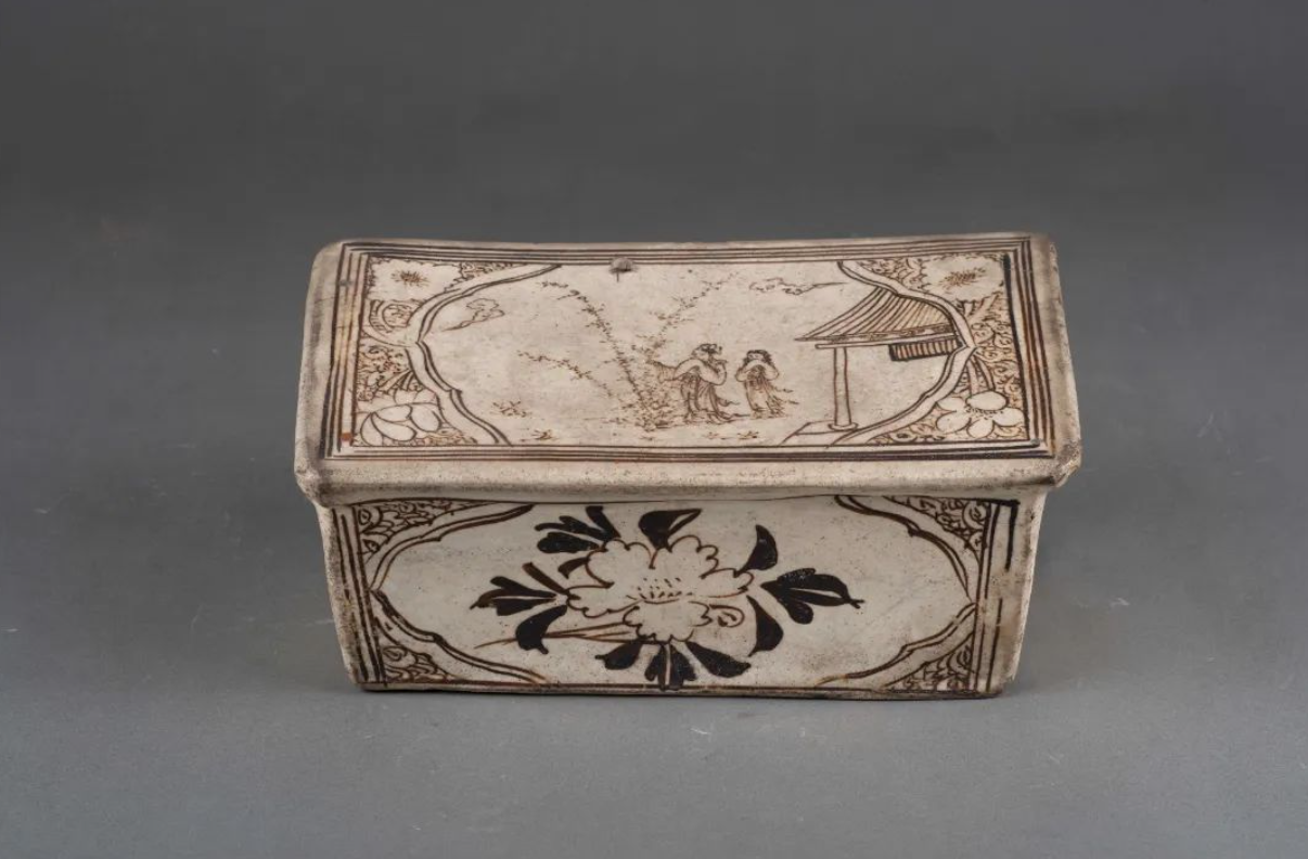 枕面开光内绘《西厢记·长亭送别》中张生远去、崔莺莺洒泪送别的场景,枕四壁开光内绘花卉等纹样,底部有“张家造”款。