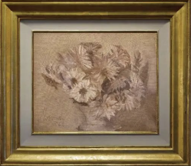 它们仅有花朵露出,茎叶被古典素雅的花瓶所掩盖,花朵之间紧紧地互相依靠着,寥寥几笔勾勒,花朵的外形介于有与无之中,真实与虚假也在似与不似之间显现的淋漓尽致。