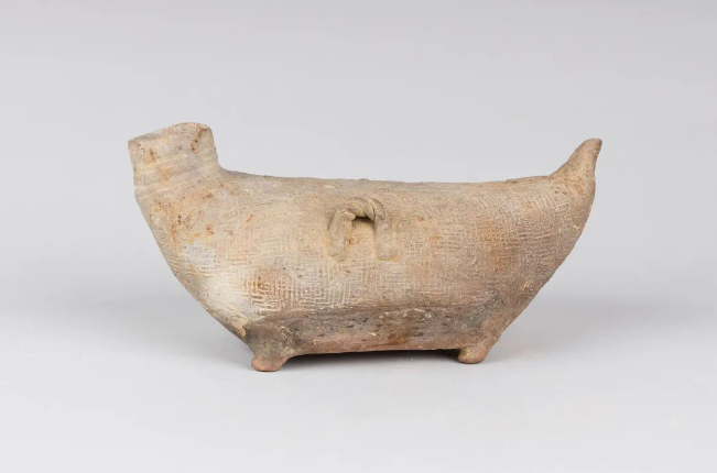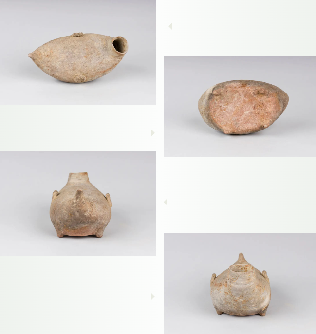 江豚是长江下游沿大运河水域的珍贵哺乳类动物,历来被百姓视为祥瑞并备受喜欢。此件江豚形壶圆口上举,颈腹浑圆,两侧贴塑一对绳索状系,小尖尾翘起,下有短小四足,腹身拍印席纹。造型朴拙优美,生动形象,兼具实用及鉴赏功能,具有特别重要的文物价值。