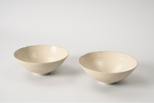 碗一对,口沿呈六瓣葵形,斜弧腹,圈足底,胎质薄细,口沿无釉。碗心模印一鹿,形象生动,内壁模印缠枝牡丹,花朵丰满,枝干矫健。印花纹饰立体清晰,釉呈典型牙白色,为金代定窑白瓷典型特征,造型美观且保存完好,属同类器物之精品。