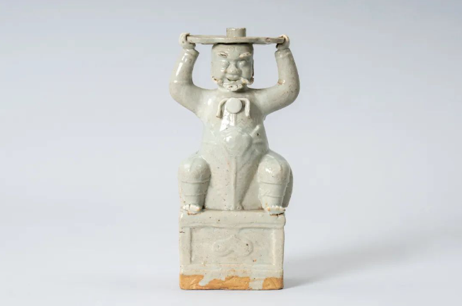 人俑头戴箍,圆目高鼻,唇角微张,双手上举,托盘于头顶,盘中部留孔,用于插香,下身半蹲,外着胡衣,腰系宽带。下端承以方形座,座后留有两孔。施青白釉,釉质浓浊。元代大一统帝国的稳定局面和开放包容的经济文化政策促进了世界多民族文化交流融合,此器造型为“波斯献宝”,形象地反映了中外文化交流的历史面貌,具有极高的历史和艺术价值。