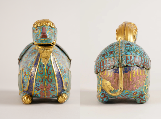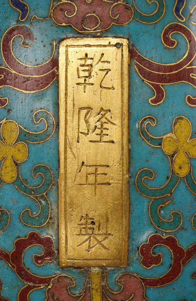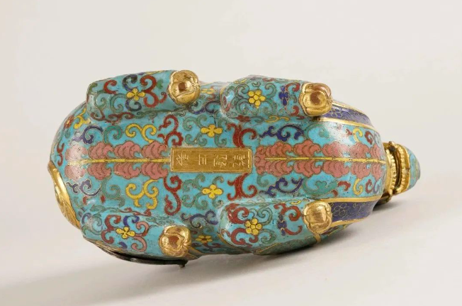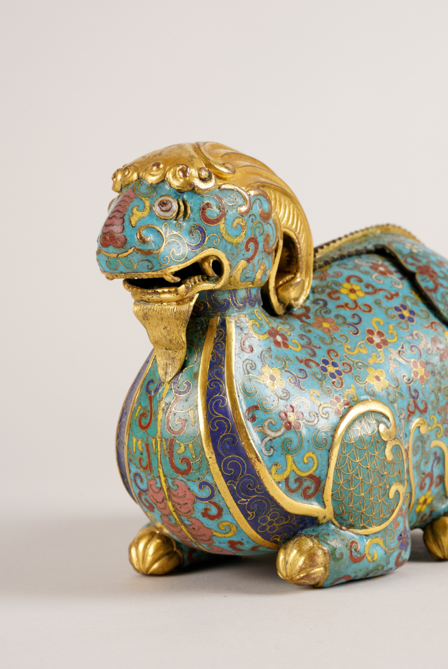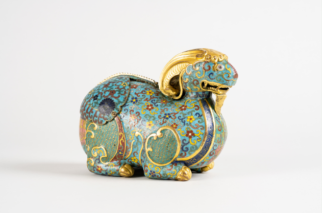 以铜胎作卧羊形态,体态丰腴饱满,口部微张,双目炯炯有神。周身以掐丝绘制各式花卉图案,天蓝色珐琅釉作地,红、黄、蓝等多色珐琅釉填绘花朵。腹底铜鎏金长方块上阴刻“乾隆年制”四字楷书款。“羊”字因发音与“祥”相近,故以羊来表示吉祥,称“大吉羊”。其珐琅质地、色彩、掐丝、鎏金都具有典型的乾隆朝特点,造型别致,工艺精湛,不仅存世稀少,又具标准款识,属清中期珐琅器代表性作品,具有极高的展示和收藏价值。