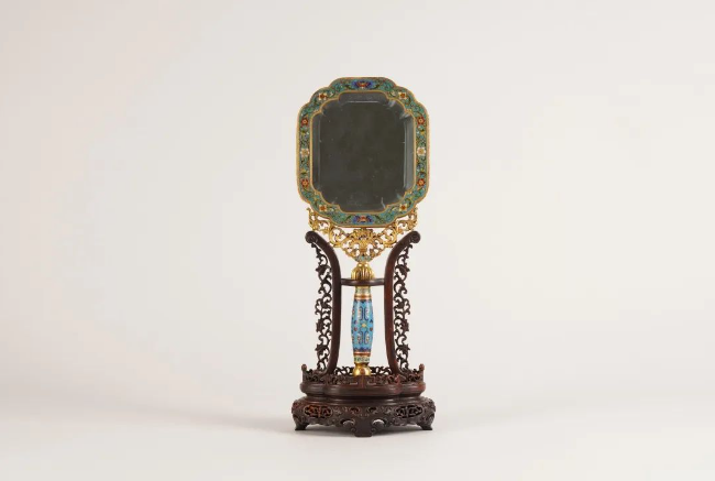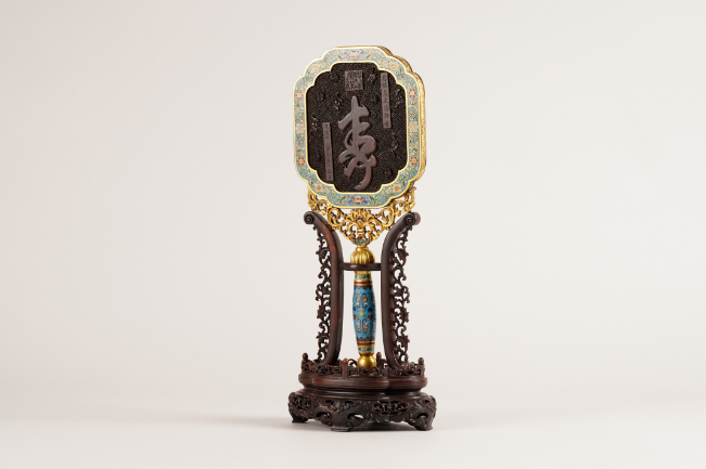 亚字形镜身,正面镶玻璃镜用以照面;镜背剔红万字锦地刻“寿”字,上方篆书“慈禧皇太后御笔之宝”,右上楷书“慈禧皇太后御笔”,左下楷书“光绪二十年十月十五日”字样,周围环绕团寿纹和蝙蝠纹。边缘嵌蓝珐琅描金花卉纹镜圈,用以固定镜面、镜背。镜身下方以卷草纹衔接棍状直柄,附镜架。光绪二十年(1894年)十月十五日为慈禧太后六十大寿后五天,《翁同龢日记》载:十月十五日光绪帝将在文华殿接见美、俄、英、法、西班牙、比利时、瑞典七国公使,此物可能为光绪帝赠七国公使贺慈禧寿诞的回礼。此镜集慈禧“寿”字御书、珐琅彩、剔红、鎏金等多种工艺于一体,巧夺天工,存世罕见,弥足珍贵。