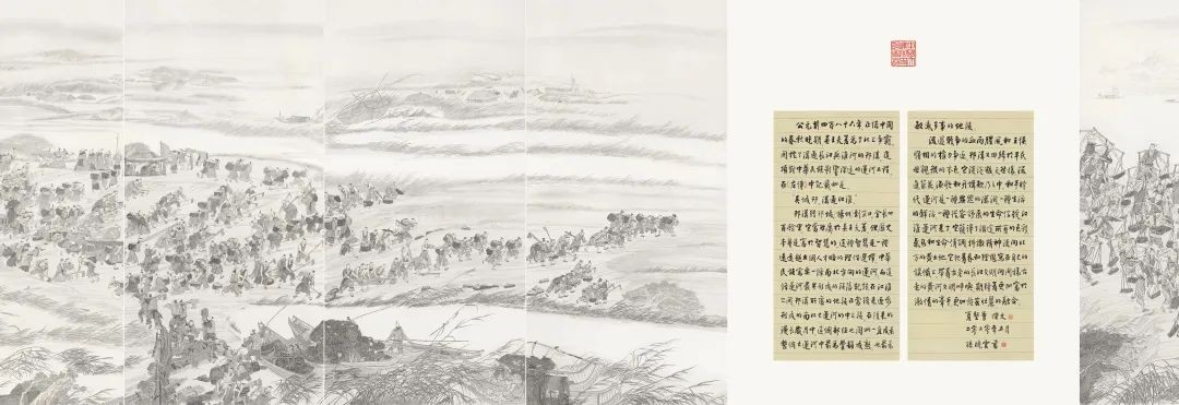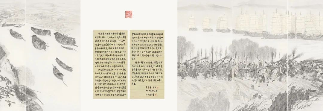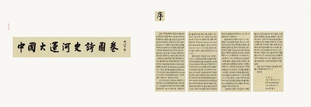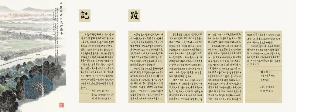 中国大运河史诗图卷分上、下两卷,上卷“中国古代伟大创举”长43米,通过春秋争霸、雄才大略、汴河畅通、一统天下四个历史画面,讲述了大运河开凿、发展、西进、完成的历史;下卷“新时代辉煌篇章”长64米,由北国瑞雪、冀鲁高秋、江淮绿野、吴越花雨四个章节组成,表现运河两岸一年四季不同景致,及改革开放以来的新气象;书法题跋长28米。作品尺幅巨大,融汇古今,由大运河沿线8省(直辖市)的15位书画家历时一年半,数易其稿而成。史诗图卷借鉴传统江苏画派的山水与人物技法,融合诗、书、画、印等多种艺术形式,勾勒出大运河长达2500年的开凿与发展历史,呈现了运河沿线的四季自然风物与繁华景象,对中国大运河博物馆具有里程碑式的意义。