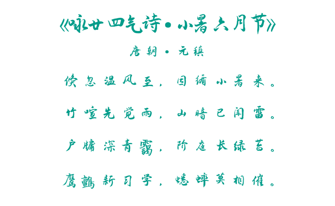 开篇这首元稹的《小暑六月节》中提到了“小暑”节气的三个物候:一候温风至,二候蟋蟀居宇,三候鹰始鸷。即小暑开始,气温上升,天气以南风为主,风中带着热浪;由于炎热,蟋蟀离开田野,迁徙到人的房前屋后鸣叫;春天出生的鹰鸇,此时学会了飞翔,为了避暑,在高处清凉的空中翱翔。