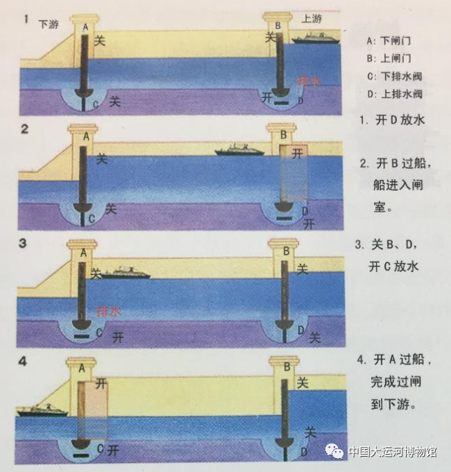 中国是世界上最早发明船闸和建造多级船闸的国家。船闸雏形是斗门,斗门出现之前靠堰埭助运。南朝宋景平元年(公元423年),扬州附近运河建造2座斗门,是京杭运河工程上最早的闸门。北宋雍熙元年(公元984年),修建了著名的真州闸,是世界上最早的复式船闸,比西方建造的荷兰船闸要早约400年。据《梦溪笔谈》记载,在复式船闸发明后的100年时间里,淮扬运河、江南运河上的堰埭几乎全部改成船闸。元代用船闸技术解决船队翻山问题,在会通河上临清与济宁之间建造了31座船闸。这就是世界上最早的梯级船闸。到明代,梯级船闸数量增至38座。就是靠着这38座船闸有序地不断提升水位又不断降低水位,浩荡的运输船队得以平稳地翻山越岭,京杭大运河上的梯级船闸工程系统要比西方同类建筑早350 年。