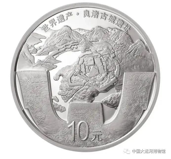 30克圆形银质纪念币背面图案为良渚古城及外围水利系统遗址